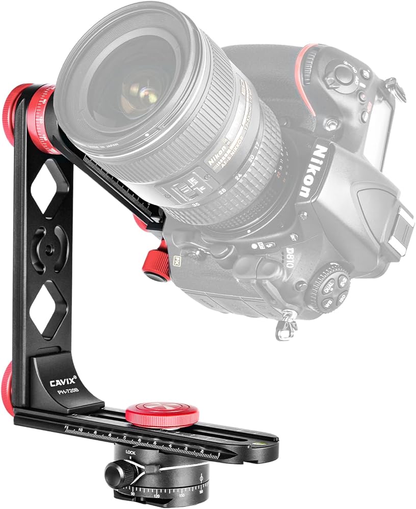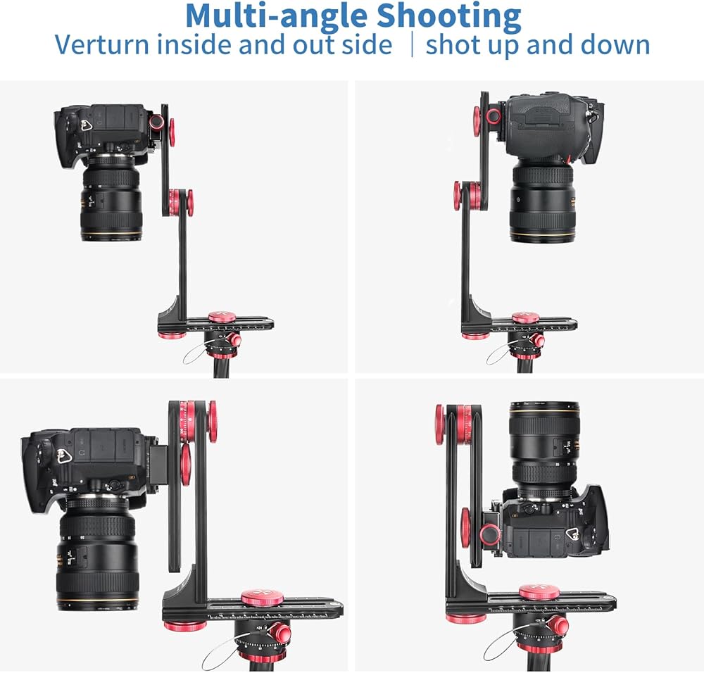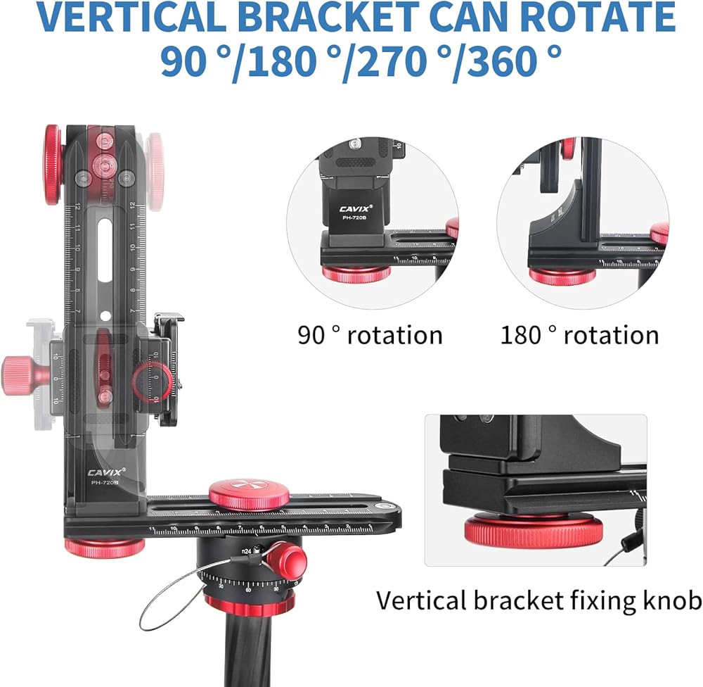 ● يتميز الذراع العمودي أيضًا بدوار قابل للتعديل مع علامات محفورة بزاوية 360 درجة ومشبك كيو ار بنمط اركا ولوحة لتركيب وفك الكاميرا.
