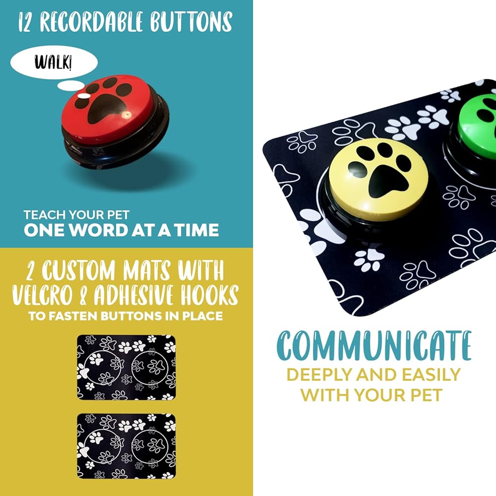 Our recordable buttons for dogs are a simple and fun solution to communicate with your dog in a simple language while allowing your pet to express its wants and needs more effectively and easier. The pack includes 12 recordable buttons with 2 mats for easy organization, which are enough to introduce your pets to communication training or add new words along the process.