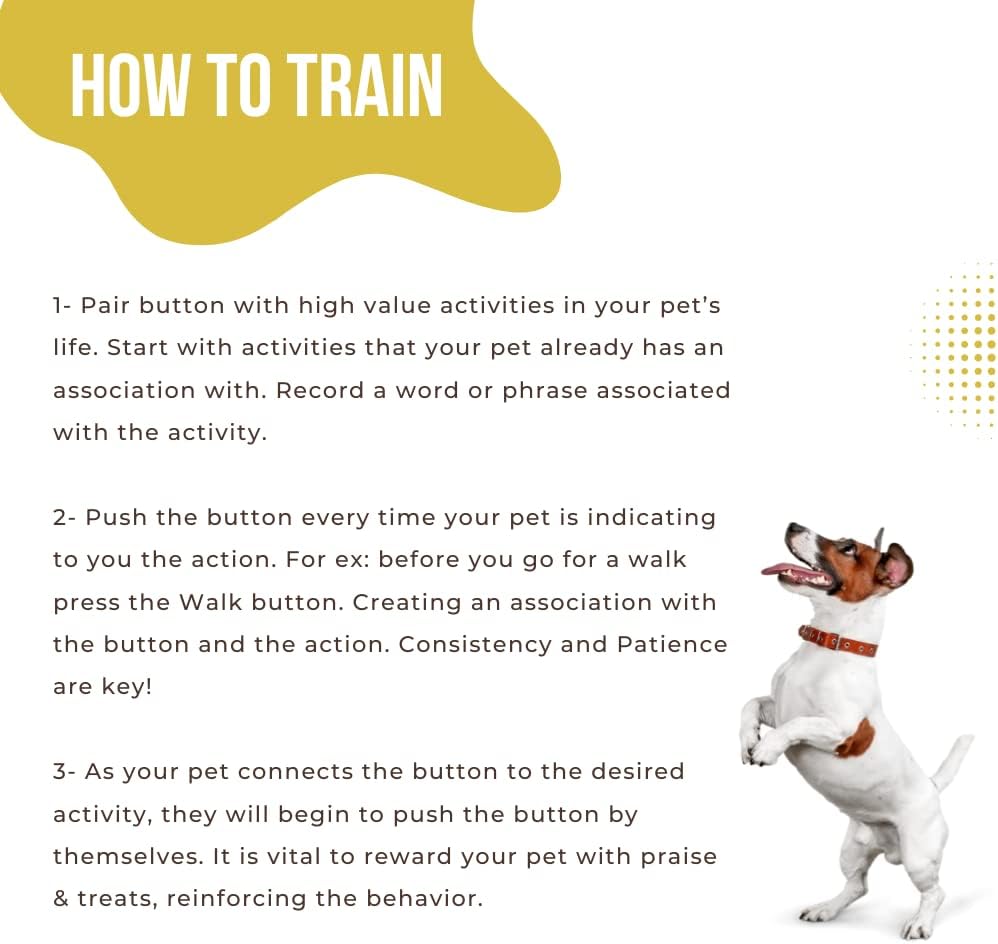2. Push the button every time your pet is indicating to you the action. For ex: before you go for a walk press the Walk button. Creating an association with the button and the action. Consistency and Patience are key!