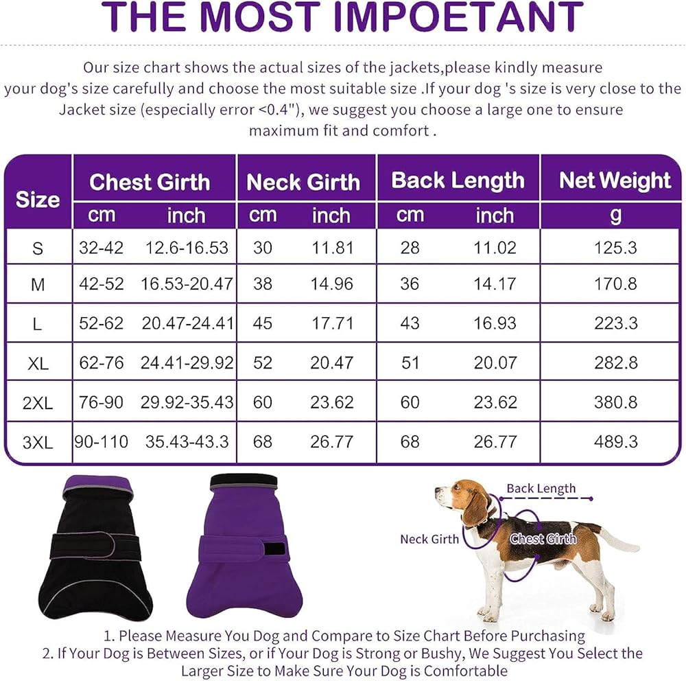 • اختر المقاس المناسب: XL (محيط الصدر 24.41 بوصة - 29.92 بوصة، محيط الرقبة 20.47 بوصة، طول الظهر 20.07 بوصة). تحتوي سترة الشتاء الدافئة للكلاب على 6 مقاسات من S إلى XXXL. يجب أن يكون تمثال نصفي الملابس أكبر من تمثال نصفي الكلب بمقدار 2-4 سم. يرجى الرجوع إلى جدول المقاسات الموجود في الصورة، ويمكنك اختيار ملابس مناسبة ومريحة لكلبك.