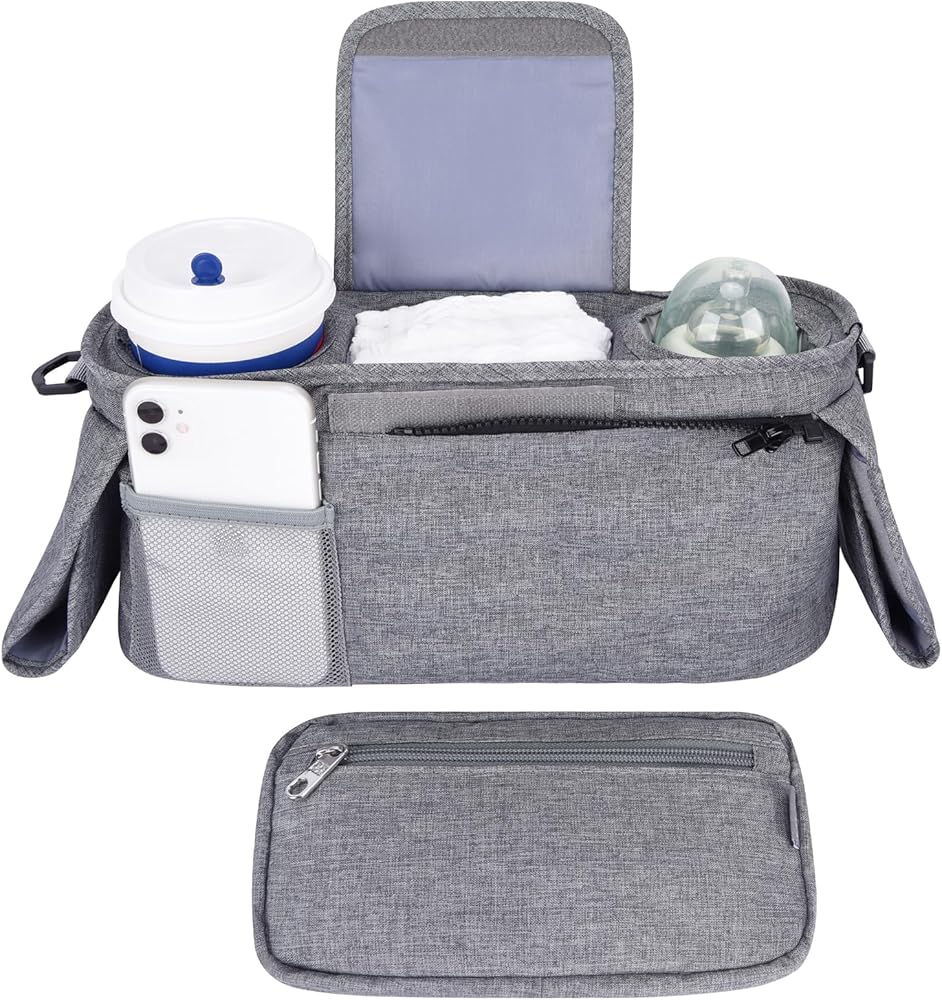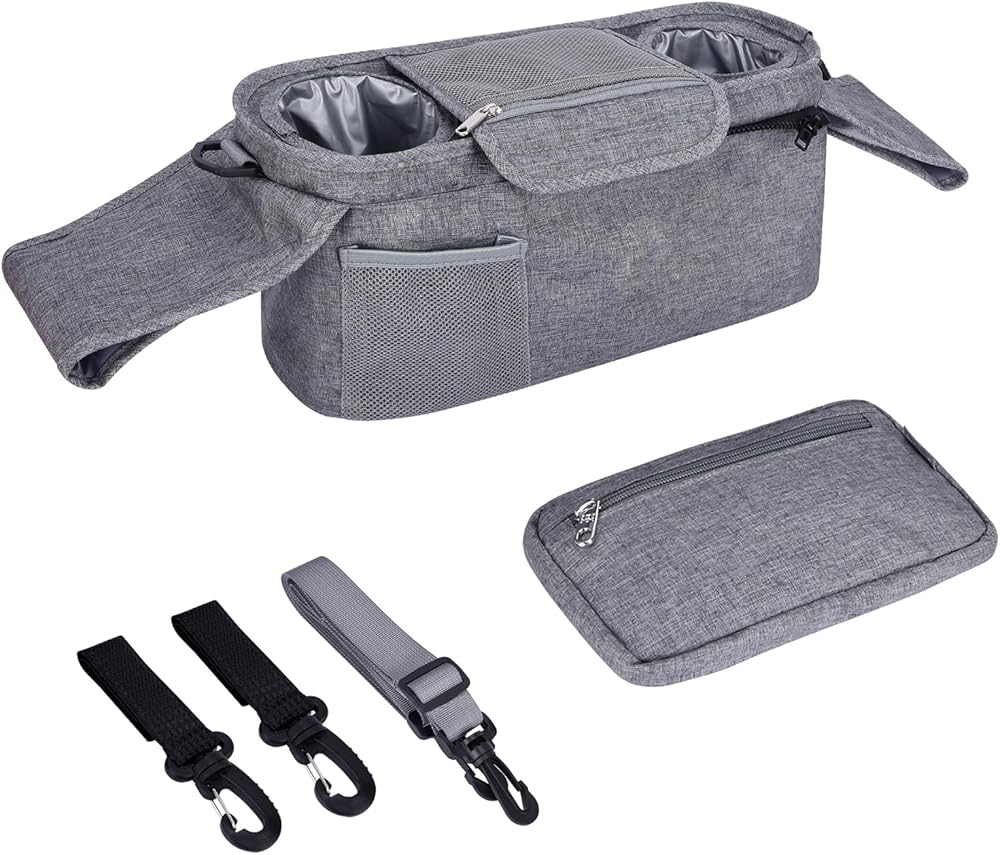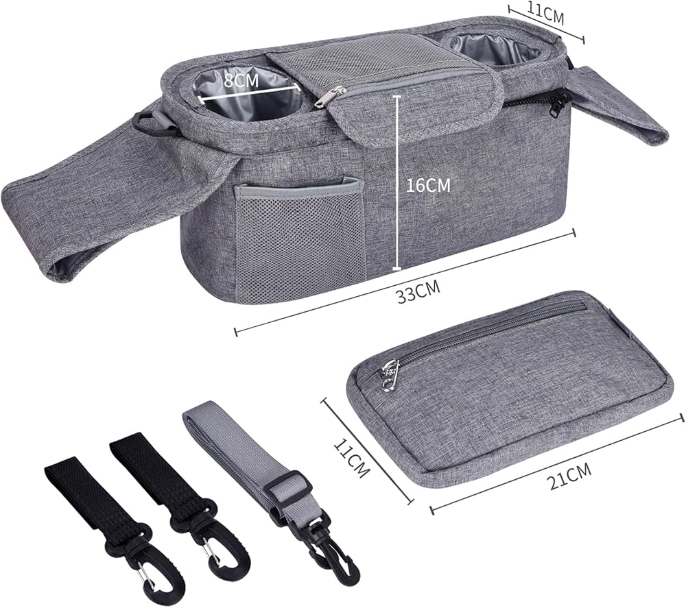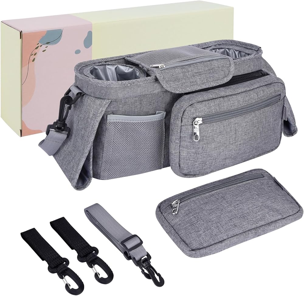 منظم عربة الأطفال من بيبيمور و3 قطع خطافات لعربة الأطفال وحقيبة تخزين للعربات التي تجرها الدواب مع جيب قابل للفصل وجيب للهاتف المحمول ومنظم للكرسي مع حزام كتف وحقيبة يد (رمادي)