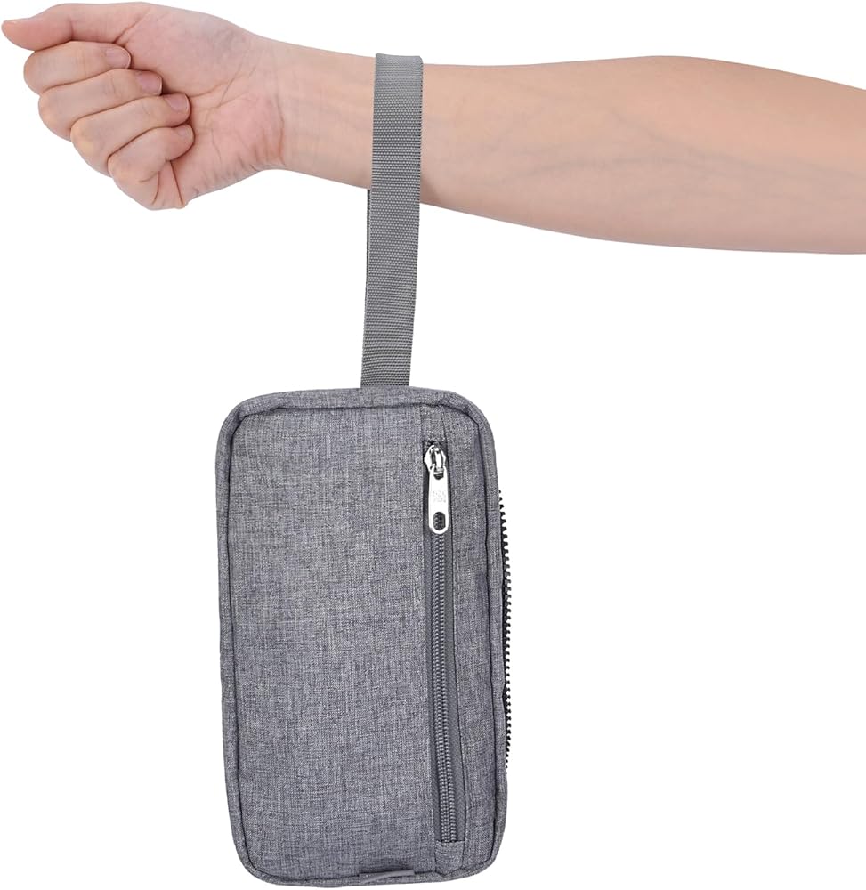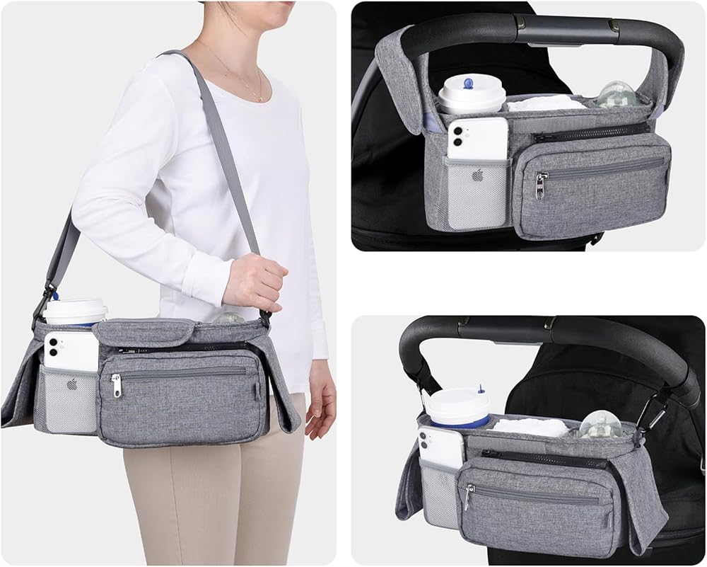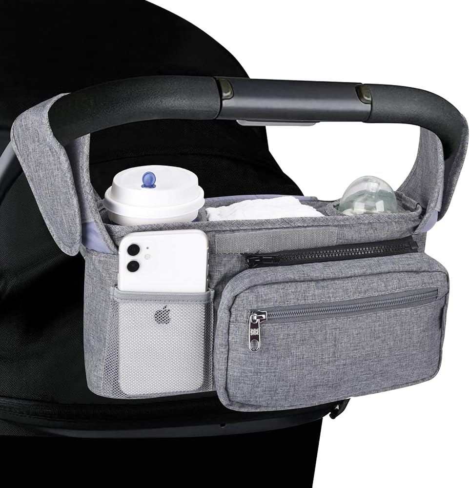 منظم عربة الأطفال من بيبيمور و3 قطع خطافات لعربة الأطفال وحقيبة تخزين للعربات التي تجرها الدواب مع جيب قابل للفصل وجيب للهاتف المحمول ومنظم للكرسي مع حزام كتف وحقيبة يد (رمادي)