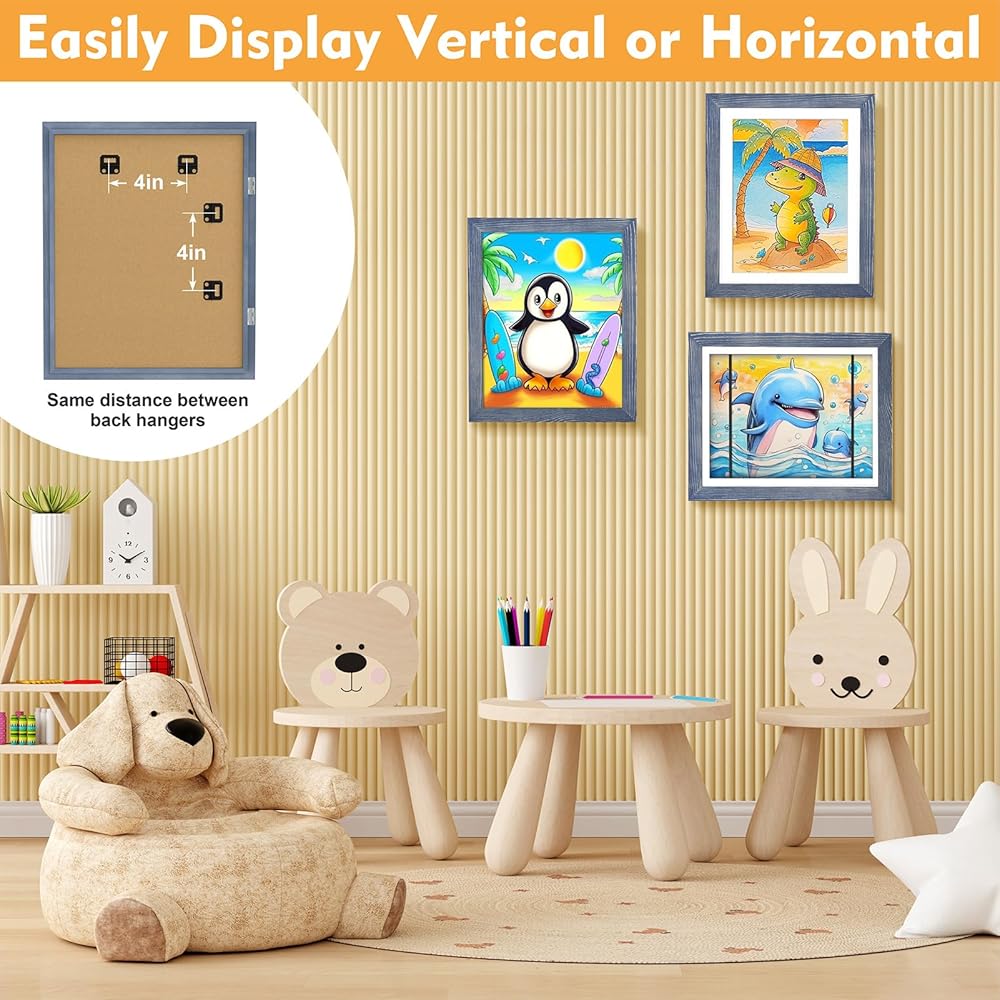 🌻عرض عمودي وأفقي: هل سئمت من تعليق الأعمال الفنية لطفلك على الثلاجة؟ إطارات الأعمال الفنية للأطفال قابلة للتغيير مقاس 8.5 × 11 مثالية للطفل لعرض إبداعاته بفخر! مجهزة بـ 4 شماعات متينة في إطار العمل الفني للأطفال، وعلاقتان أفقيتان بعيدتان بشكل متساوٍ عن الشماعات العمودية، إطارات الأطفال الفنية المزودة بمساحة تخزين تسمح للأطفال بالتعليق عليها الجدار من الأفقي إلى الرأسي، لا مزيد من السقوط أو تلف الأرضية. مثالية لديكور غرفة الأطفال، وغرفة الأطفال، وغرفة الألعاب، وغرفة الدراسة، وغرفة النوم!