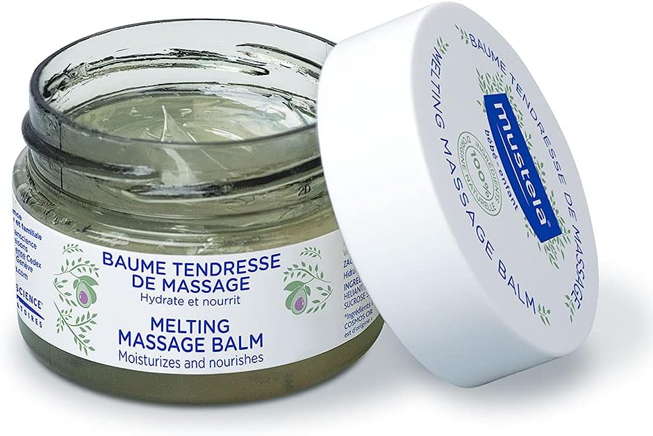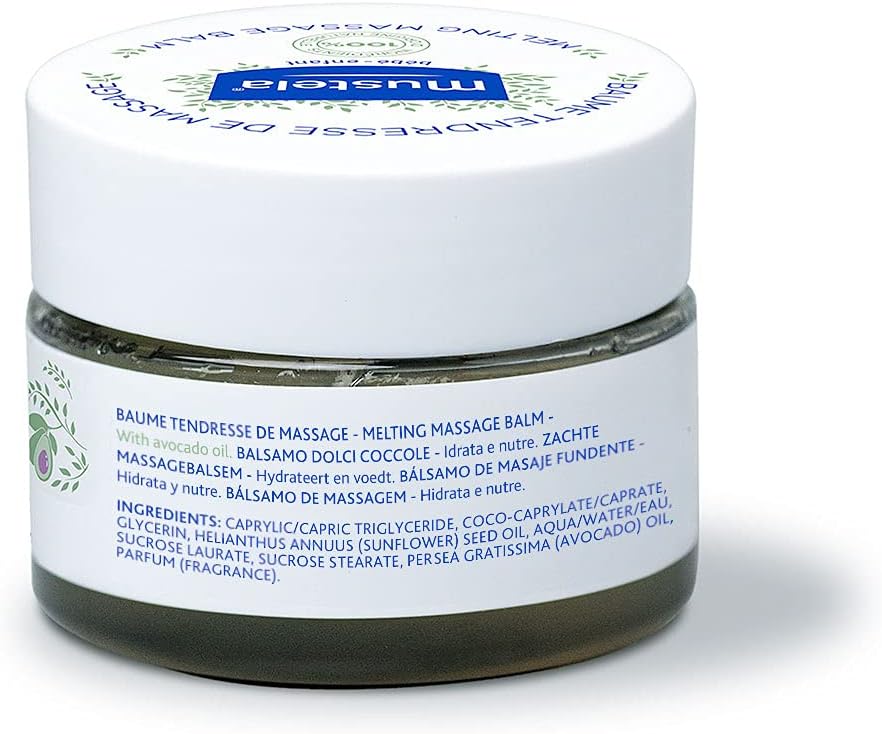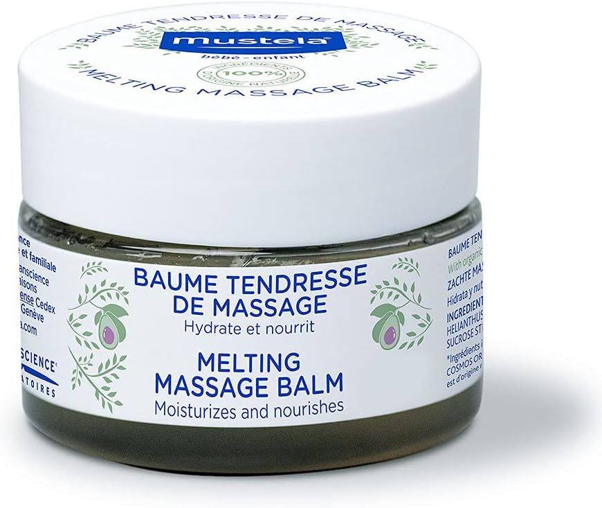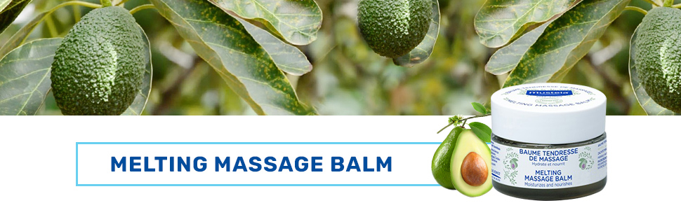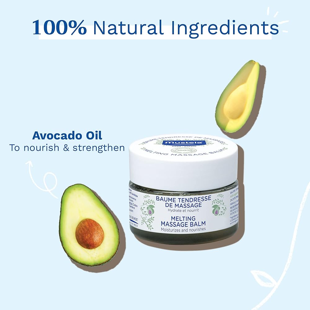 Luxurious Balm For Baby Massage Mustela's Melting Massage Balm is designed to moisturize and nourish your baby's skin, leaving it supple and soft. With its luxurious melting texture, this balm is perfect for giving your child a relaxing and gentle massage.Use our Melting Balm during a baby massage to create a special bonding moment with your little one, enhance their wellbeing, and stimulate their senses. Composed Of 100% Ingredients Of Natural OriginMustela's Melting Massage Balm is made with 100% naturally derived ingredients. These 9 simple ingredients include Sunflower Oil to moisturize and soften the skin, Glycerin to moisturize and lock in the hydration, and Avocado Oil to nourish and strengthen the skin barrier. The minimalist formula is vegan, meaning that it is free of ingredients of animal origin. Plus, Melting Massage Balm is crafted with a natural fragrance to leave a unique and pleasant scent. A Baby Massage That's Good For Your Family And The EarthBaby massage improves baby-parent bonding, contributes to your baby's wellbeing, and can help your baby relax and fall asleep faster. And the melting and sensorial texture of Mustela's Melting Massage Balm creates a unique sensory experience for you and your little one.But that's not all! This product is also good for the planet. Our Avocados are sourced from sustainable farms, and the entire jar (except for the cover) is made from 100% recycled plastic. Clinically Proven And Safe For BabiesMustela's Melting Massage Balm has been tested under dermatological control and is safe to use from birth on. You can rest assured that this balm is: * Paraben-free* Phthalate-free* Phenoxyethanol-free