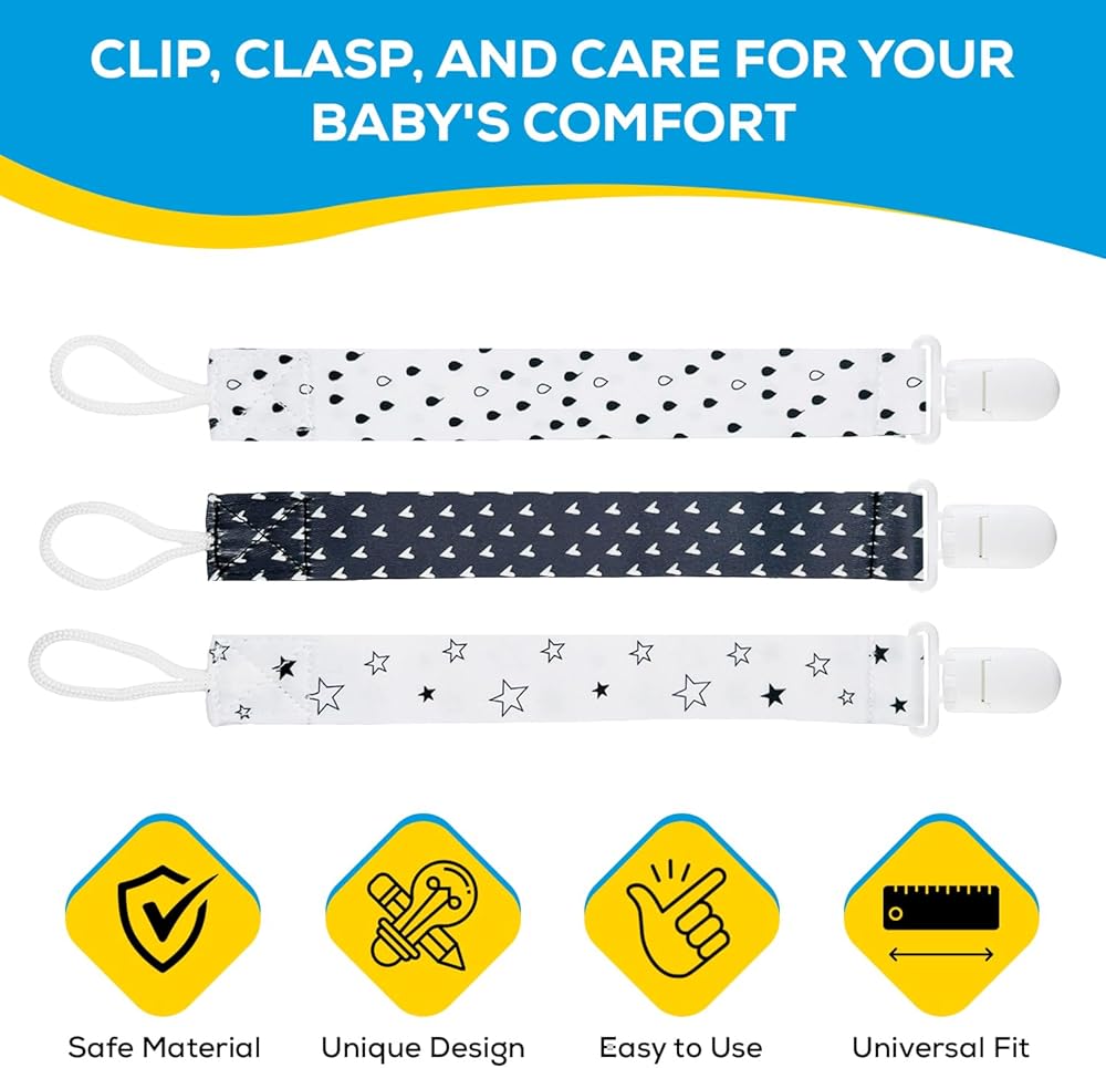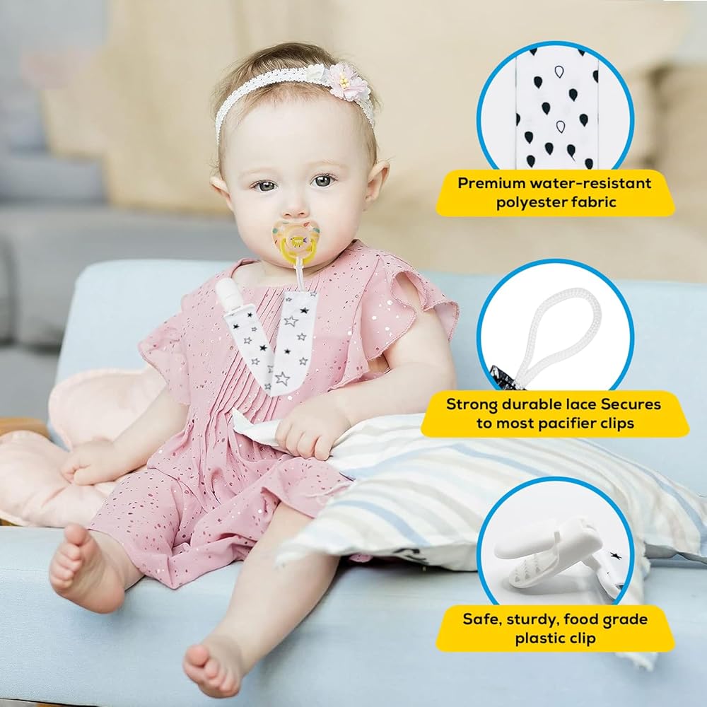 ✅ NO MORE LOST PACIFIERS - Made of high-quality, soft-to-the-touch, machine/hand washable durable polyester. The high-quality clip ensures the pacifier stays securely attached. Unlike other metal clip chains, these are equipped with a baby-proof plastic clip that is non-toxic.
