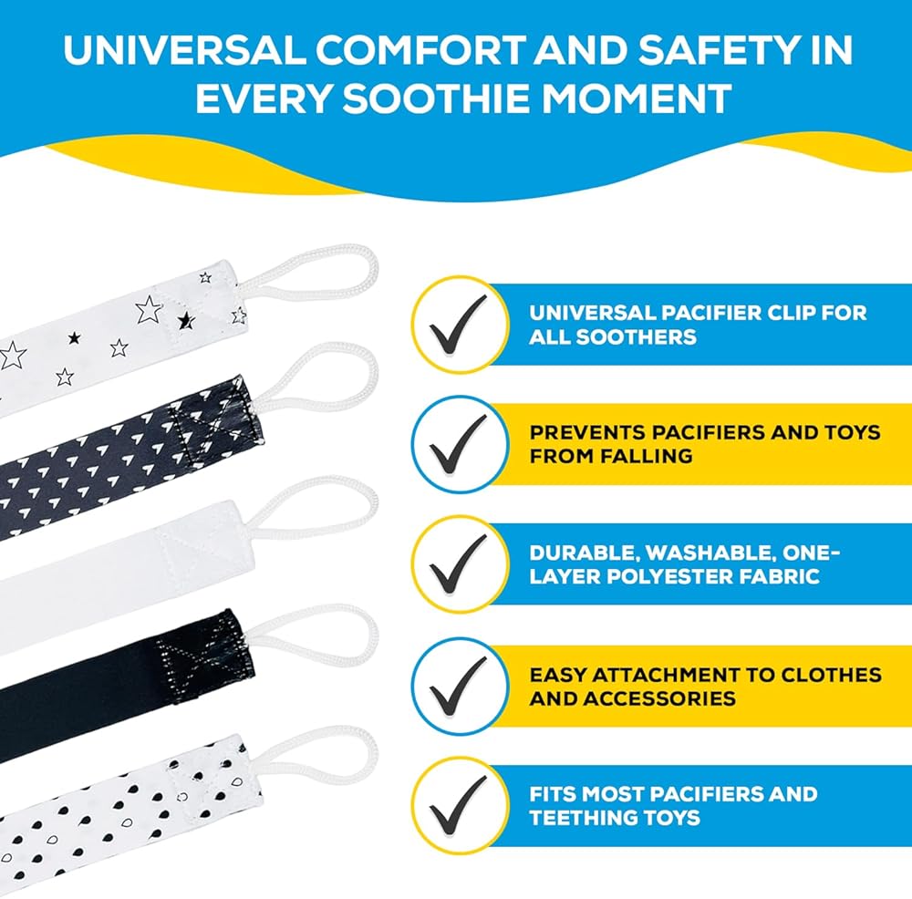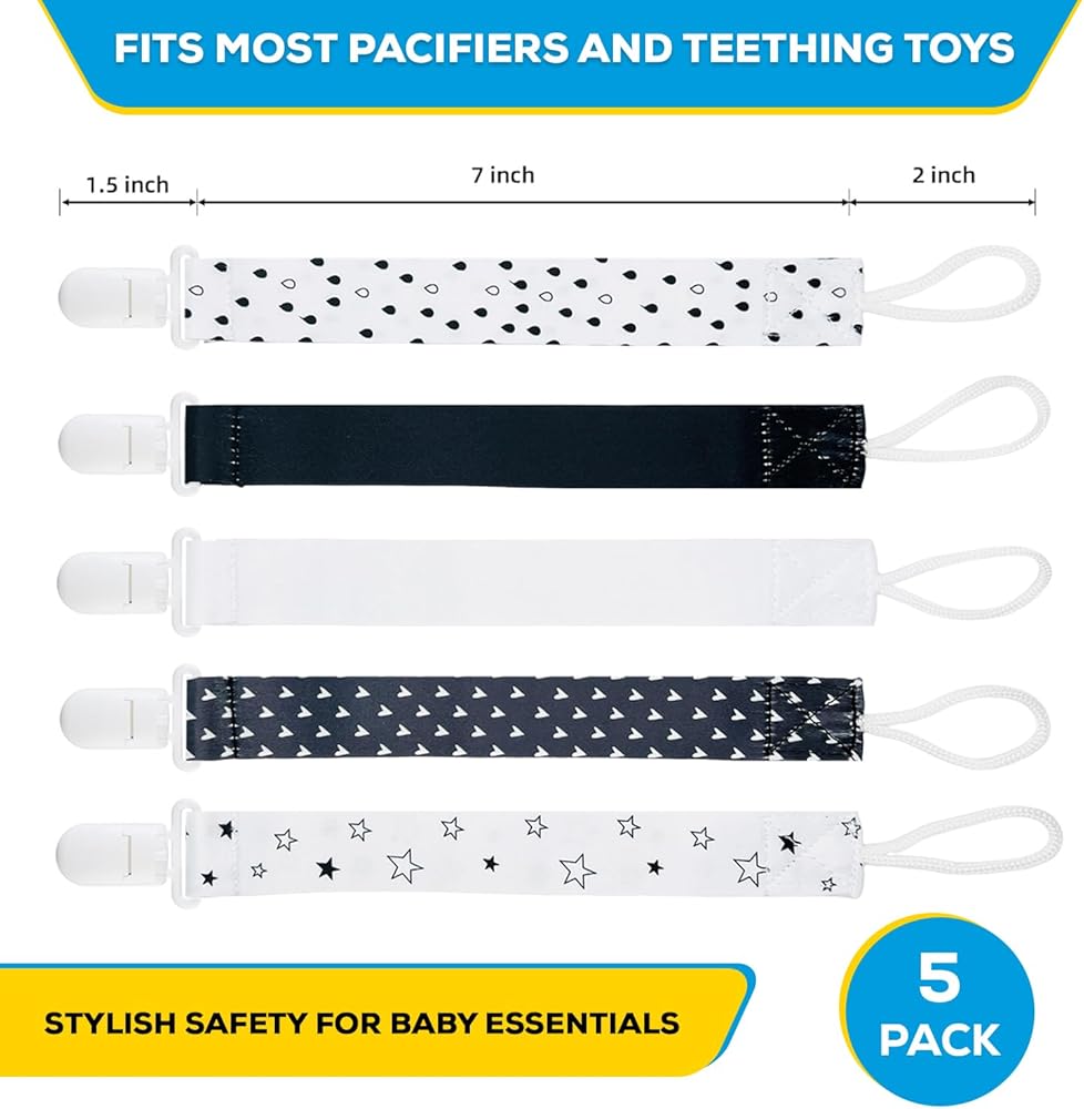 مجموعة 5 مشابك لهاية للأطفال من الأولاد والبنات، تناسب معظم اللهايات، وتحمي طفلك، وأنماط بينكي وعضاضات الأطفال والألعاب والهدايا - باللونين الأبيض والأسود