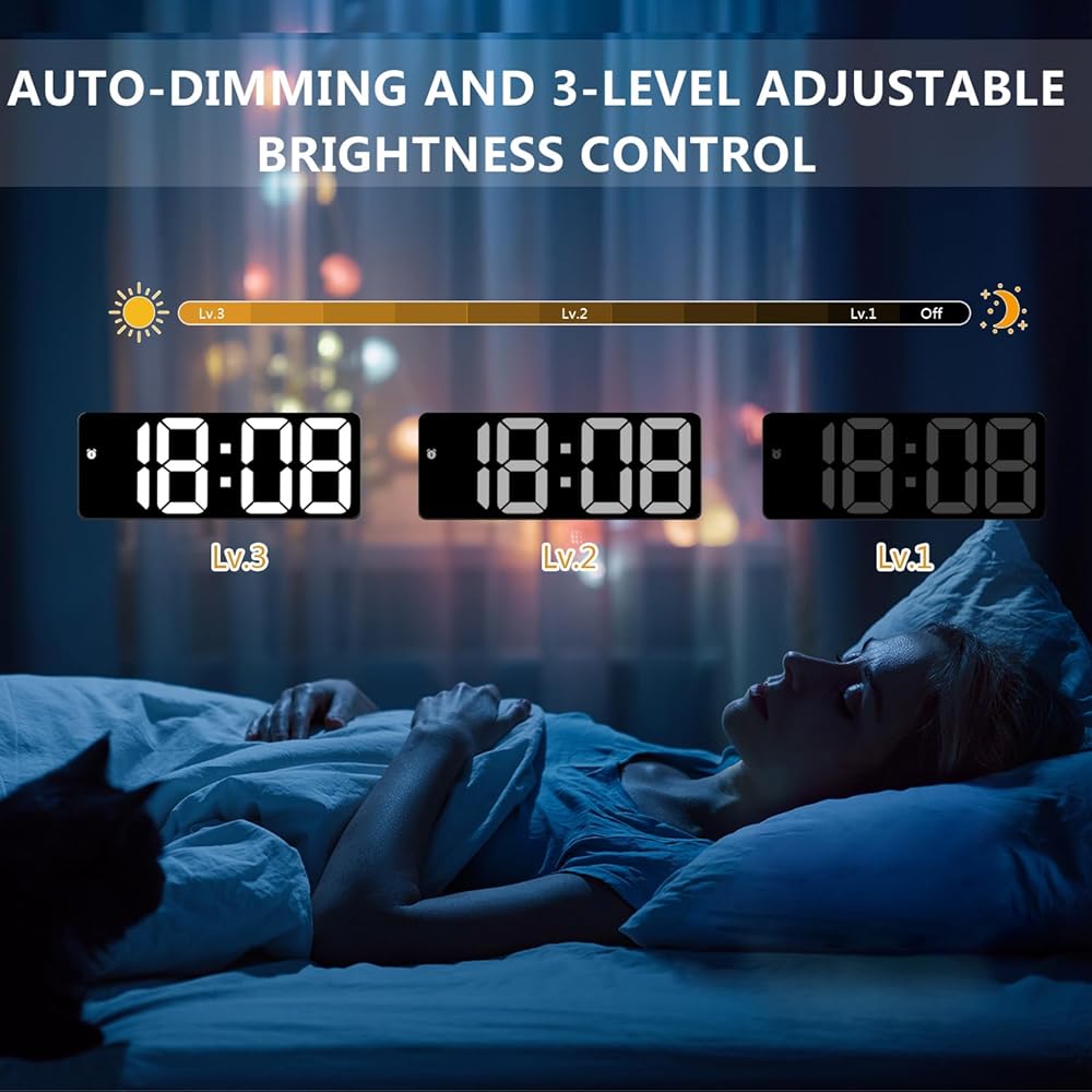 Adjustable brightness, 3-level manual adjustment and automatic adjustment. You can set the time of automatic mode (night mode) according to your work and rest rules. Whether it is day or night, you can clearly see the time, even at night, there will be no dazzling lights, and it can even be used as a small night light, guard your night. (Note that in bright light, numbers will not be displayed clearly.) Long press LIGTH/SNOOZE for 5s, the screen will light off.