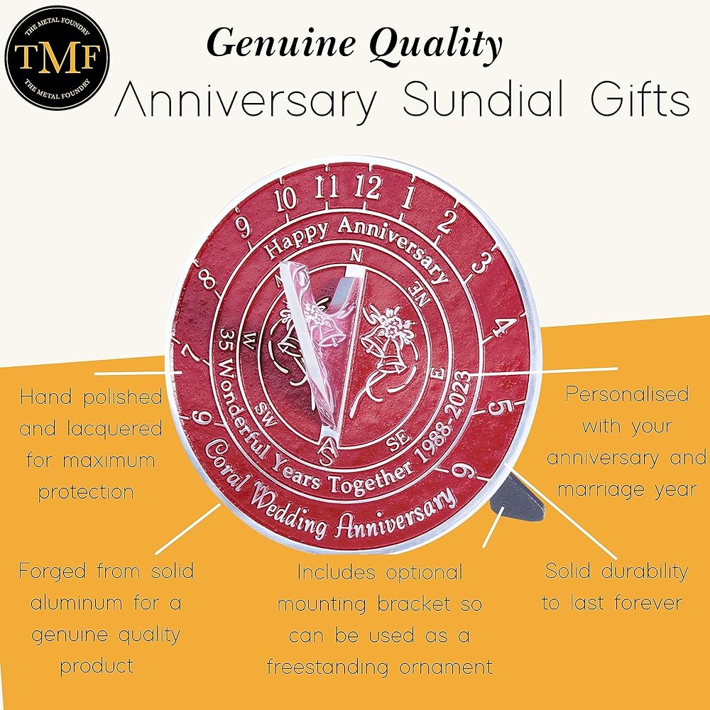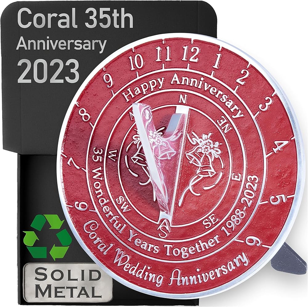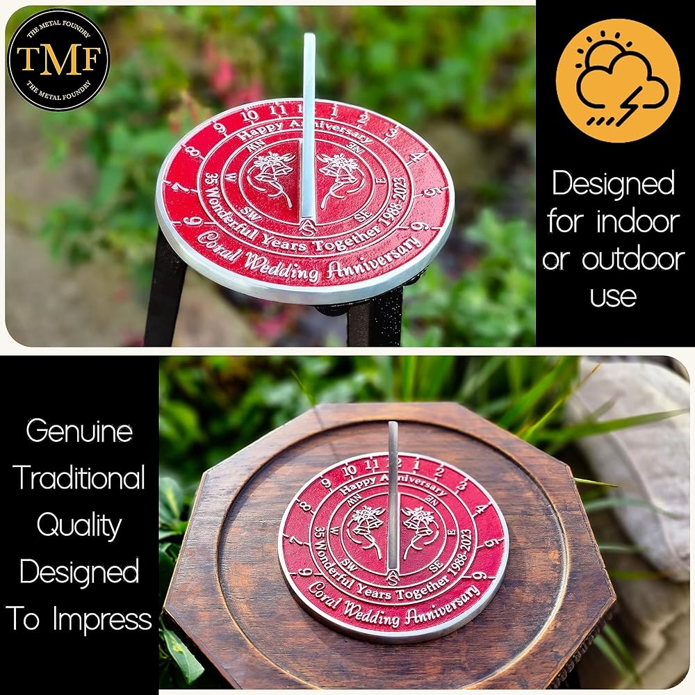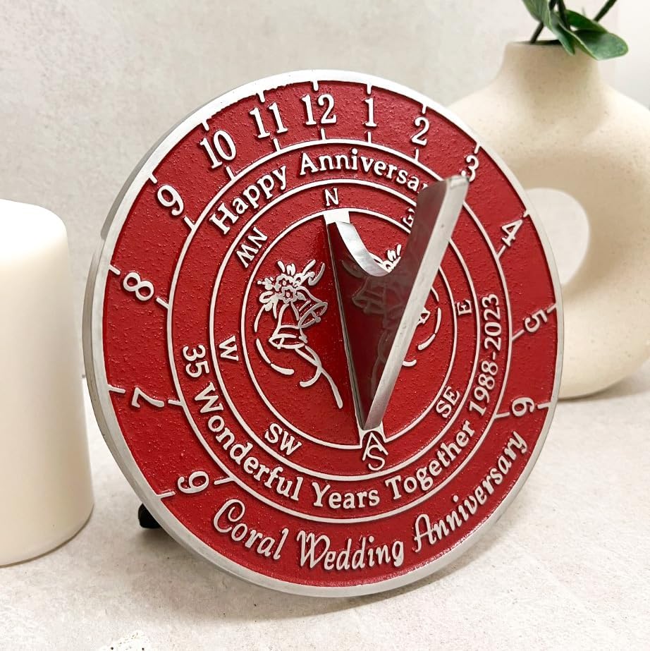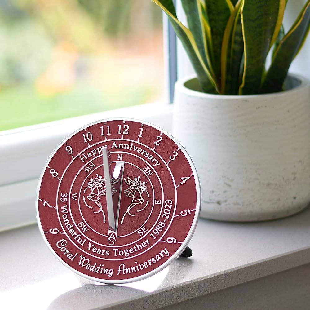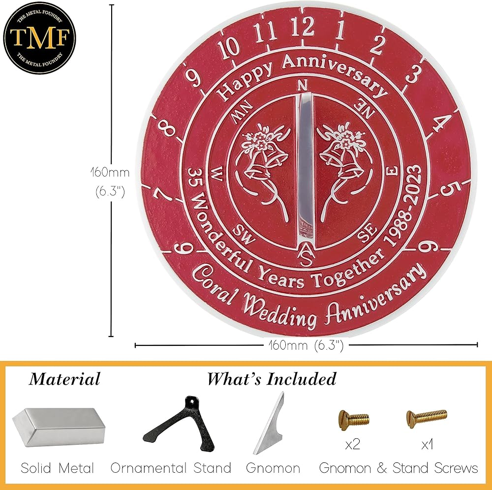 الأبعاد - يبلغ قياس هذه الساعة الشمسية 16.4 سم عرضًا × 7.6 سم ارتفاعًا، وهي الحجم المناسب تمامًا لإلقاء "ذكرى سنوية سعيدة". 35 عامًا رائعًا معًا 1988 - 2023. الذكرى السنوية لزواج المرجان في نسيج المعدن نفسه.