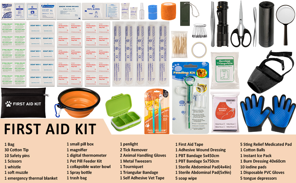 • 🐶WONDERFUL GIFT FOR PETS --- This wonderful pet first aid kit is suitable for cats, rabbits and lots of dog breeds like Labrador, Bulldog, Golden Retriever... It also can be a great gift for friends or family who has the pets. Excellent Service: We are confident that you'll satisfied with this purchase. If you have some questions with our products, please contact us and we will work to make you feel satisfied.