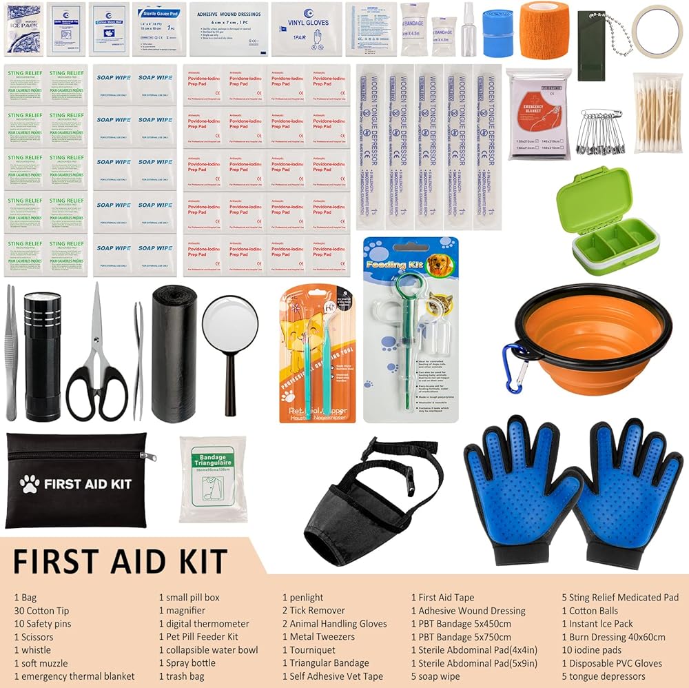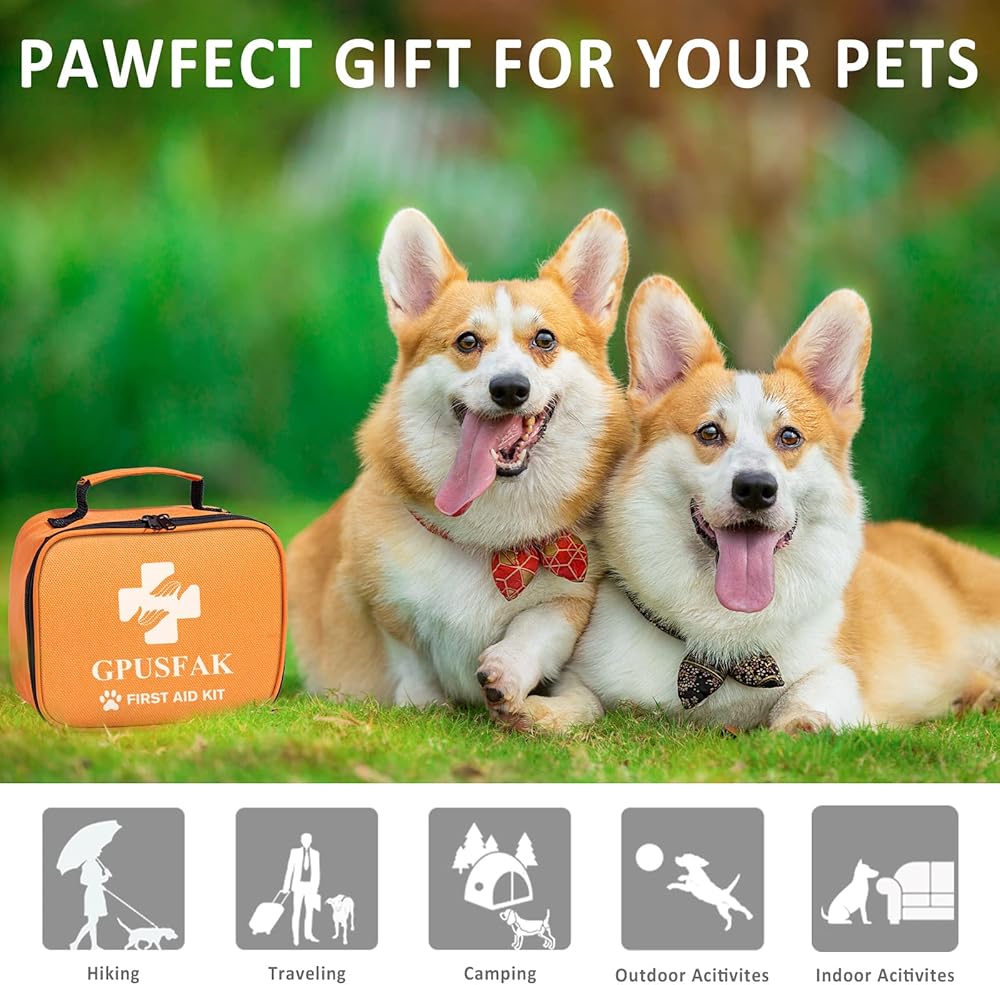 مجموعة الإسعافات الأولية للحيوانات الأليفة من GPUSFAK للكلاب والقطط - مجموعة طوارئ للحيوانات الأليفة مع فرش العناية وقفازات مستلزمات الإسعافات الأولية للمنزل والتخييم والمشي لمسافات طويلة والسفر والصيد والرياضة
