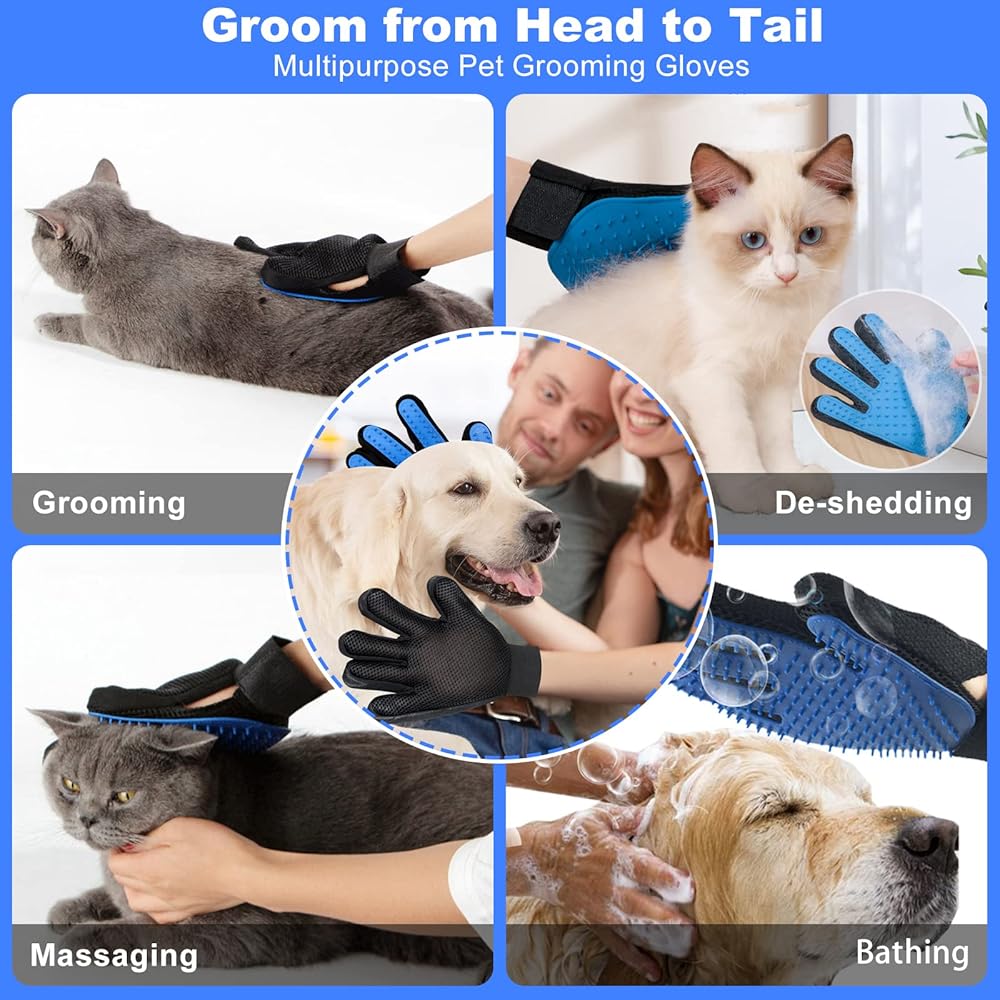 • 🐶PET GROOMING GLOVES --- With enhanced 255 silicone grooming tips that doubles as a hair remover and bath brush. Brushes off dust and loose hair from your pet's body, grooming hard-to-reach areas such as the tail or face Soft and relaxing massage for pets without painfully removing hair or scratching skin. 2 pet gloves (1 left hand and 1 right hand) have adjustable wrist straps for a comfortable fit for all.