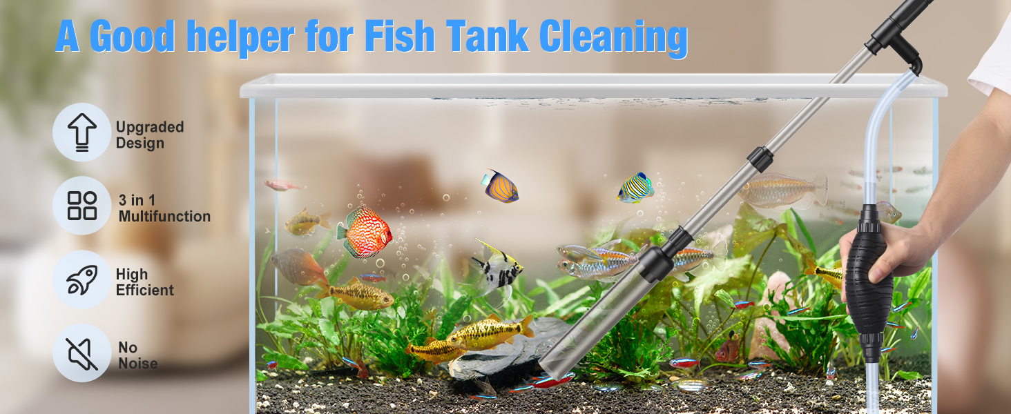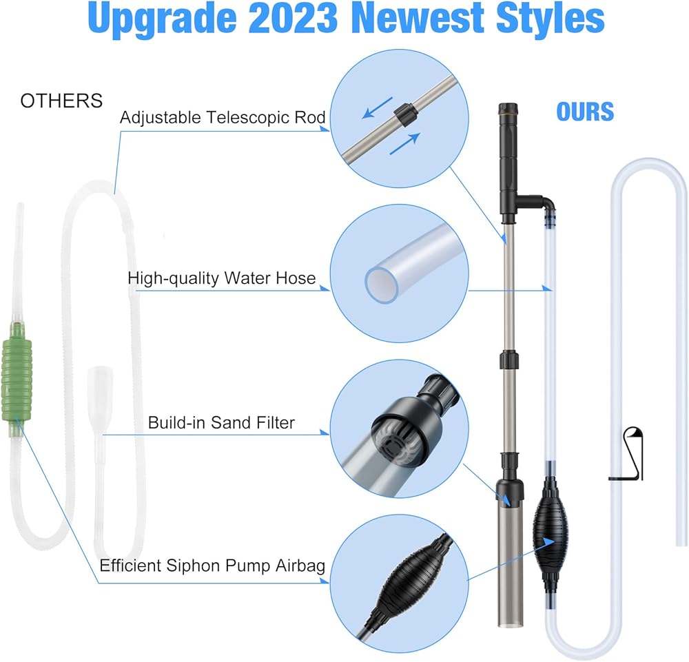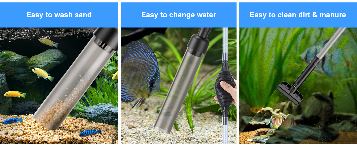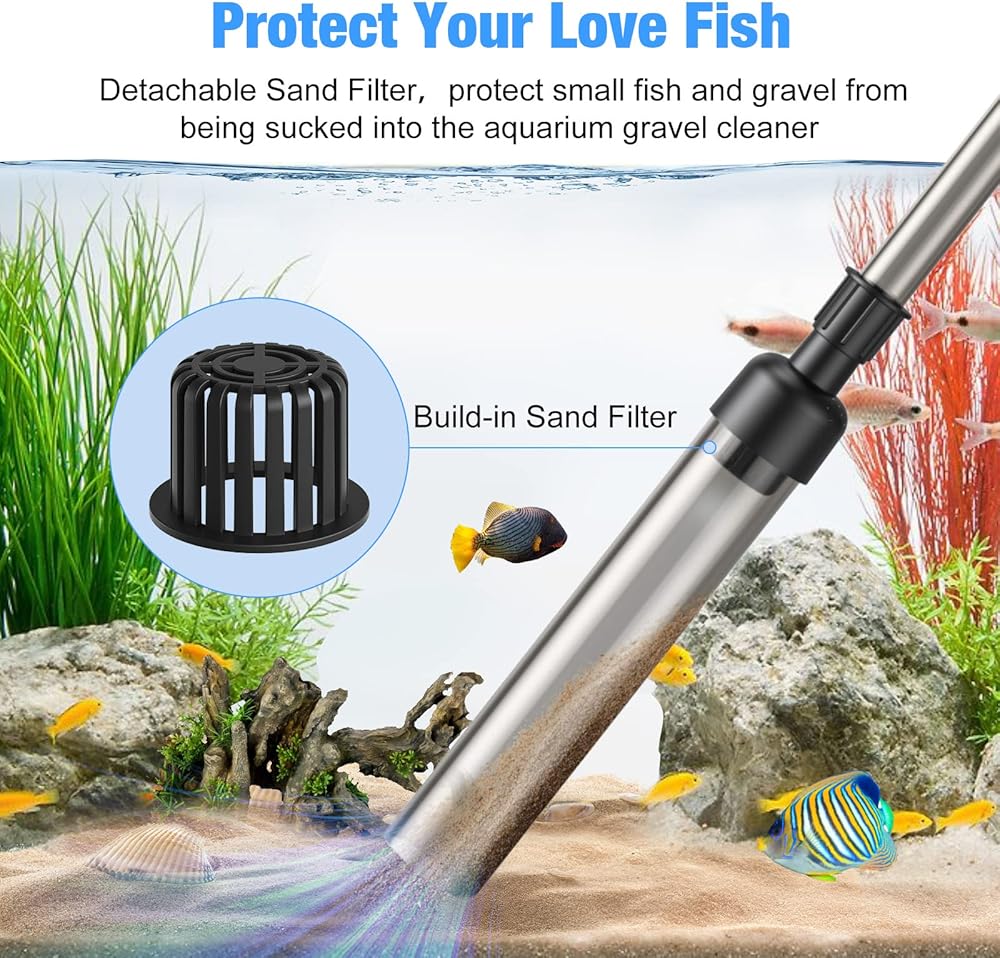 🐟 【وظيفة 3 في 1】حافظ على نظافة حوض السمك الخاص بك وأسماكك سعيدة مع وظيفة مكنسة الحصى 3 في 1: تغيير الماء، شفط الأوساخ، غسل الرمل. يساعدك تصميم السيفون المفرغ على تغيير الماء بسهولة وكفاءة. يسهل منفذ الشفط إزالة البراز والشوائب، بينما تمنع سلة الفلتر القابلة للإزالة امتصاص الأسماك الصغيرة والحصى.