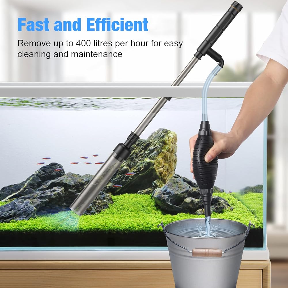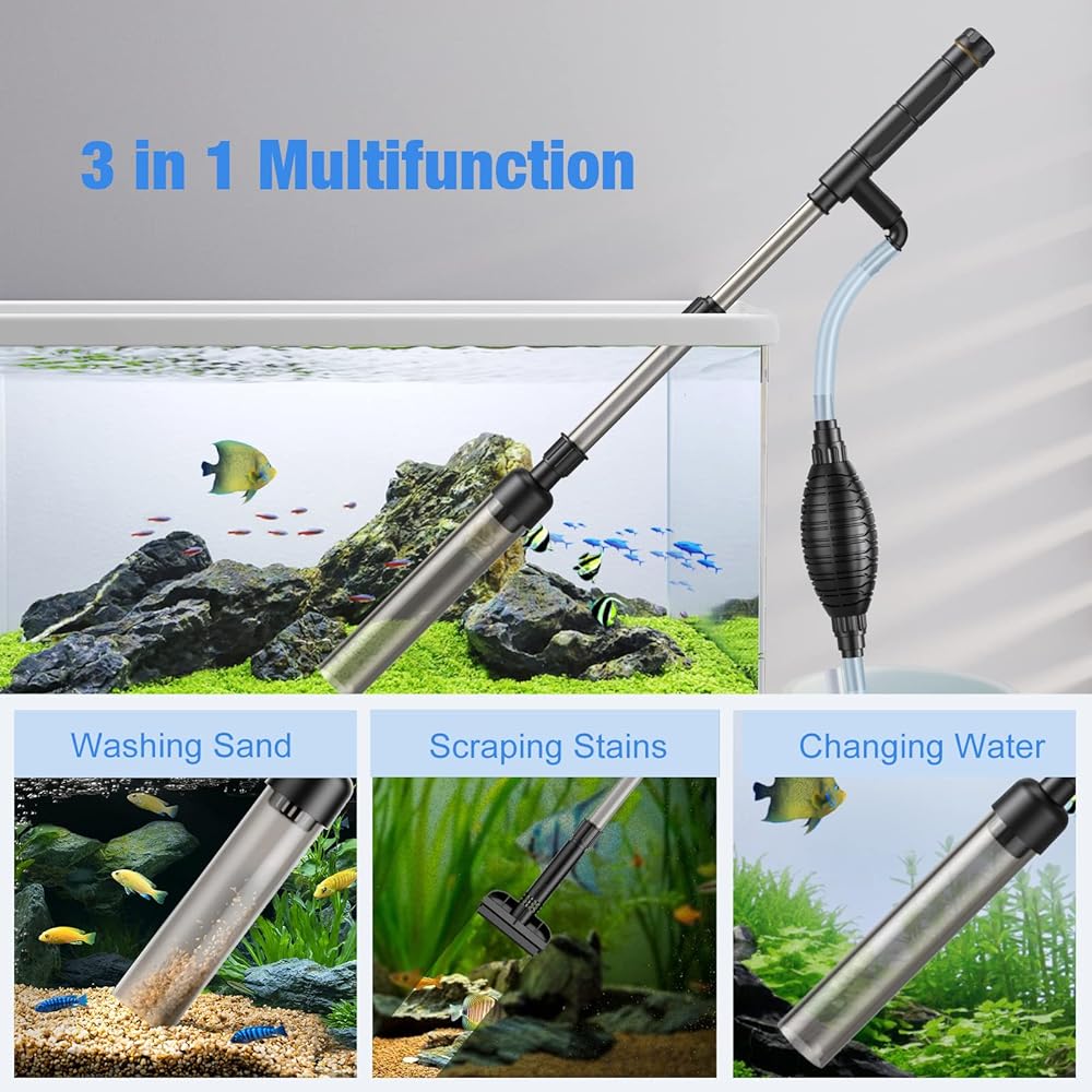 بيدي منظف حصى حوض السمك اليدوي، منظف حصى حوض السمك، طقم مكنسة كهربائية 3 في 1 لحوض السمك لتغيير المياه وتنظيف الرمال وازالة الاوساخ مع قضيب تلسكوبي قابل للتعديل