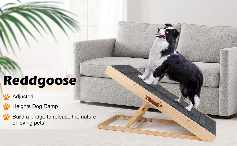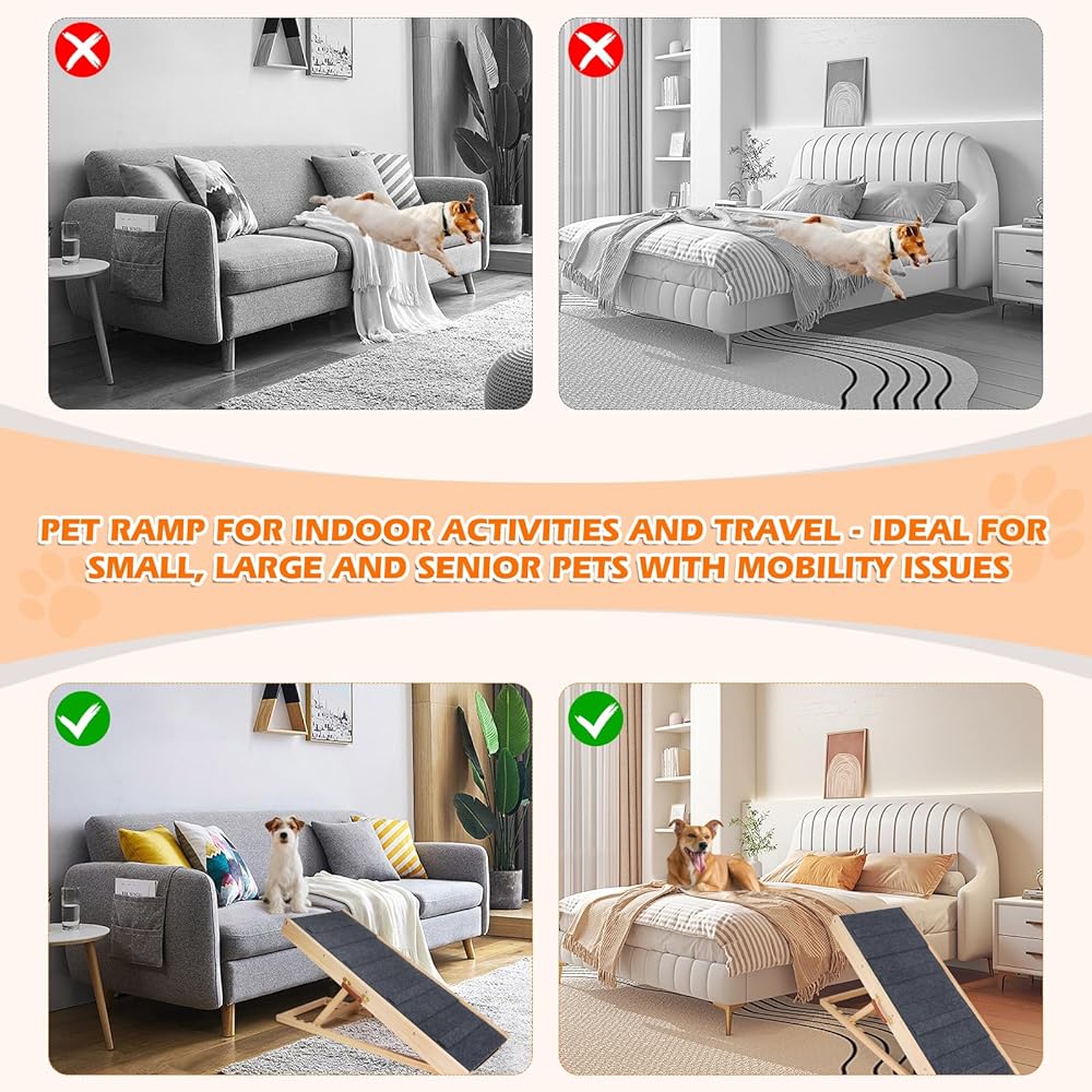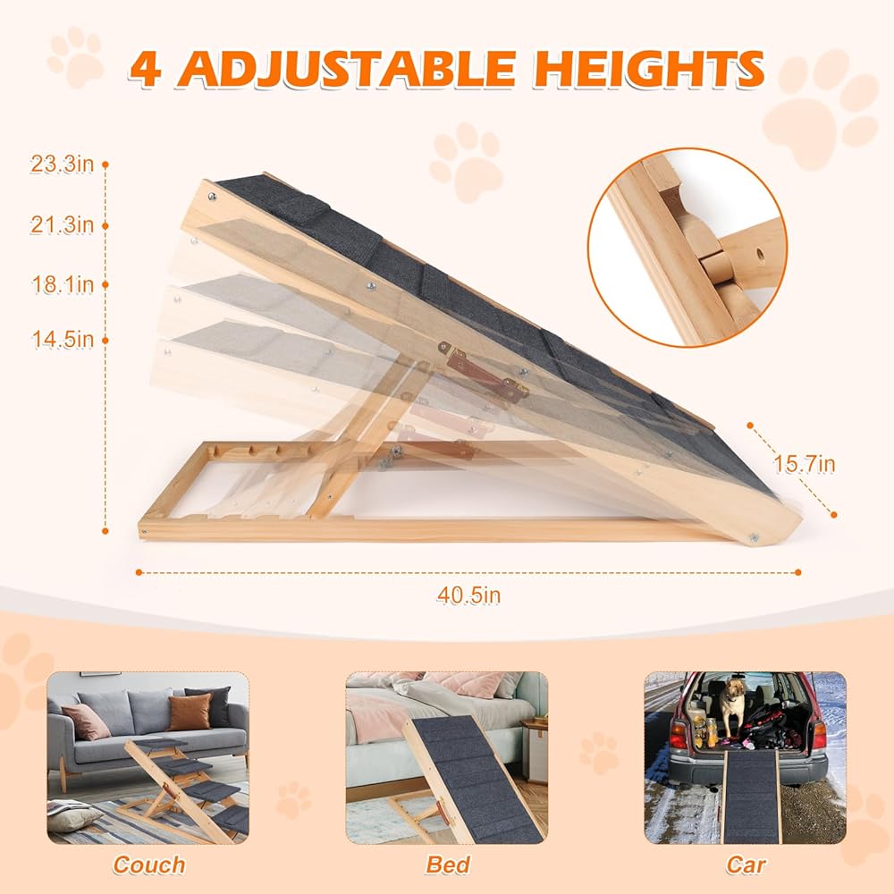 سلالم للكلاب ذات ارتفاع قابل للتعديل - يحتوي منحدر الكلاب على 4 ارتفاعات قابلة للتعديل: 14.5 و18.1 و21.3 و23.3 بوصة. يساعد جميع أحجام الكلاب والقطط والحيوانات الأليفة الأخرى على الدخول والخروج من الأماكن ذات مستويات الارتفاع الصعبة مثل السيارات والأرائك والأسرة والأرائك. منحدر الحيوانات الأليفة ذاتي الدعم ولا يحتاج إلى وضعه على سيارة أو أثاث. من الآمن إبقاء صديقك الأليف في الأعلى والأسفل في أوضاع مختلفة.