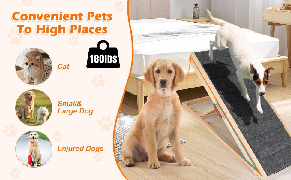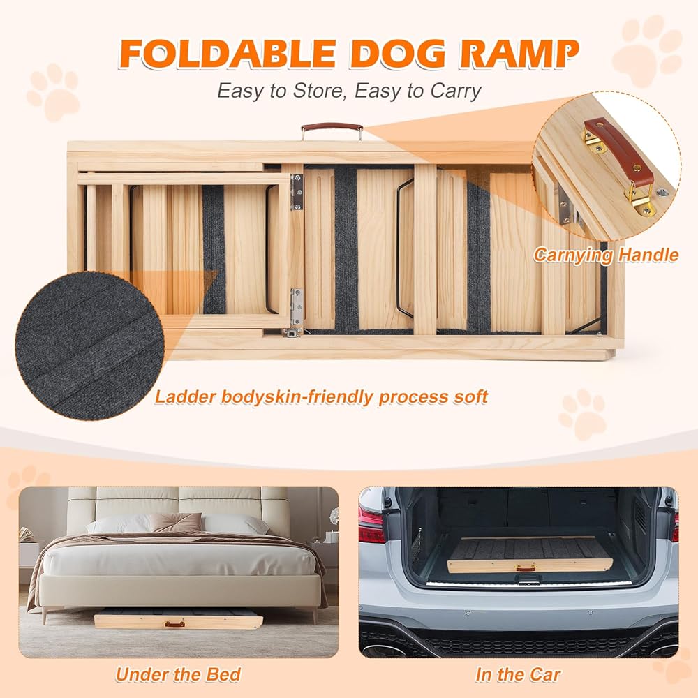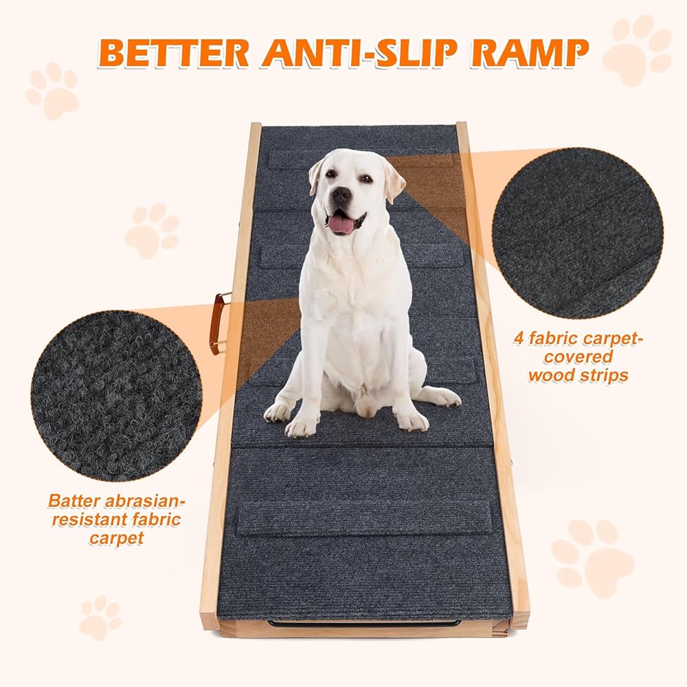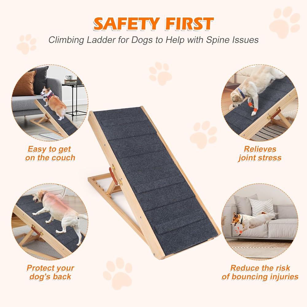 متينة وغير قابلة للانزلاق - سلالم الكلاب الخاصة بنا مصنوعة من إطار من الخشب الصلب بنسبة 100%، مما يضمن هيكلًا آمنًا وقويًا. يوفر الهيكل الخشبي الصلب دعمًا قويًا، مما يجعله متينًا ومقاومًا للكسر. على عكس سلالم الحيوانات الأليفة العادية، فإن سطح منحدر الكلاب الخاص بنا مغطى بسجادة من نسيج الجر تتميز بشرائط خشبية صغيرة متعددة، مما يمنع صديقك المكسو بالفراء من الانزلاق أثناء المشي. كما يحمي سطح السجادة الناعم أقدام حيوانك الأليف من الإصابة أثناء الاستخدام.
