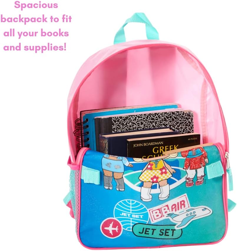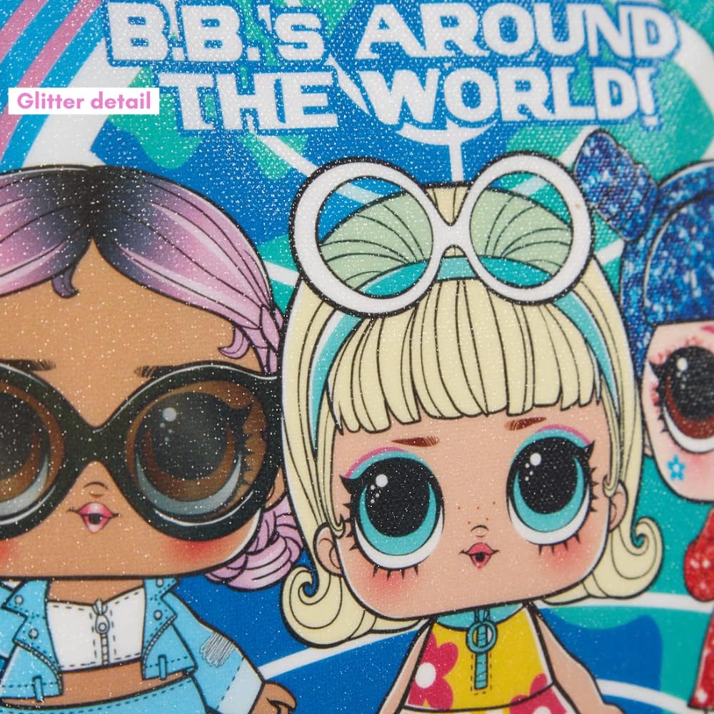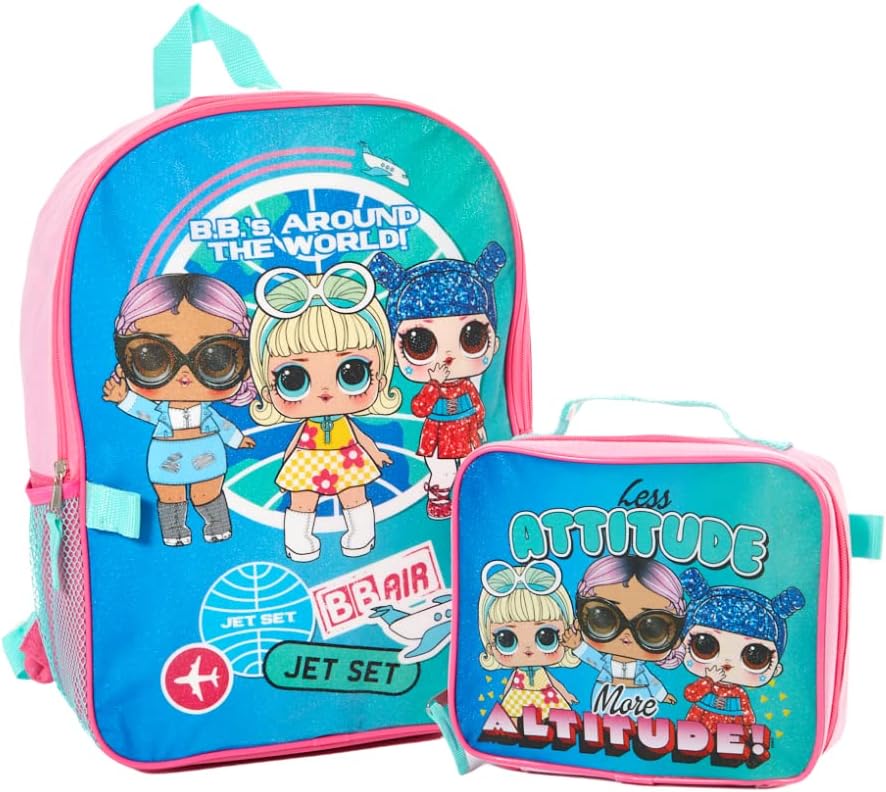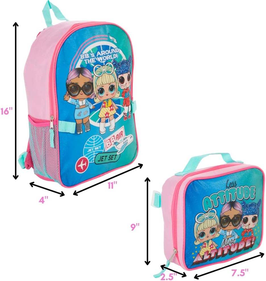 مجموعة شنطة ظهر دمى لول - تتضمن المجموعة الكاملة حقيبة ظهر كبيرة الحجم (16 × 11 × 4 انش) مع دمى ال او ال وتفاصيل لامعة على الجزء الأمامي من كليهما، وصندوق غداء مطابق.