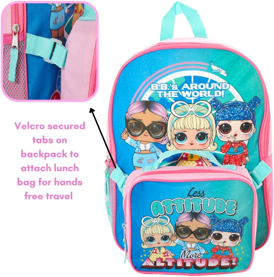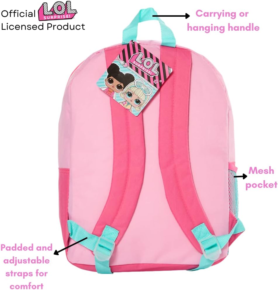 شنطة ظهر ال او ال سربرايز 16 انش مع صندوق غداء للبنات، حزمة قيمة، بينك وازرق