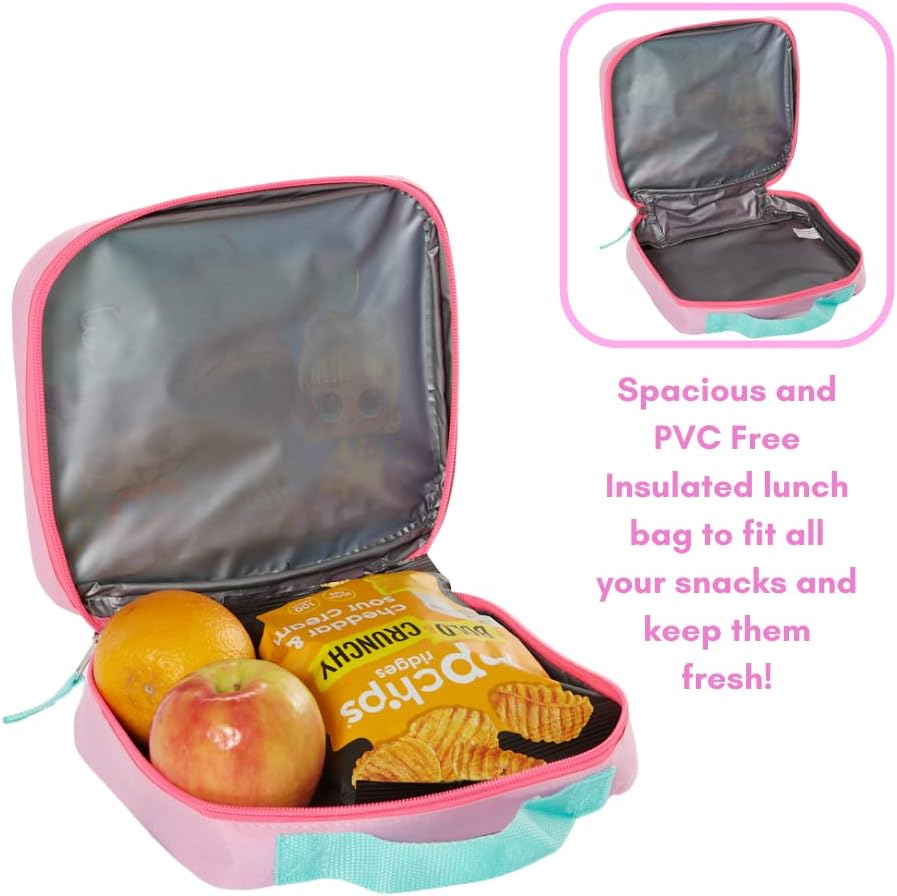 تتضمن حقيبة غداء لول سربرايز معزولة - يمكن ربط صندوق الغداء الكبير المتضمن (9 انش × 2.5 انش × 7.5 انش) مع مقبض حمل علوي بالجزء الأمامي من حقيبة الظهر مع عروات فيلكرو للسفر بدون استخدام اليدين من وإلى المدرسة. حقيبة الغداء تناسب صندوق بينتو مقاس 10 × 6 × 2.