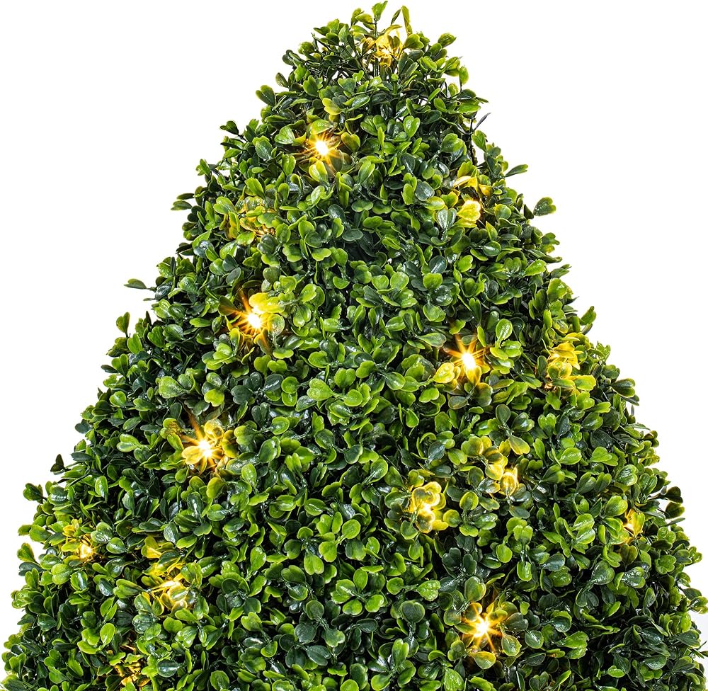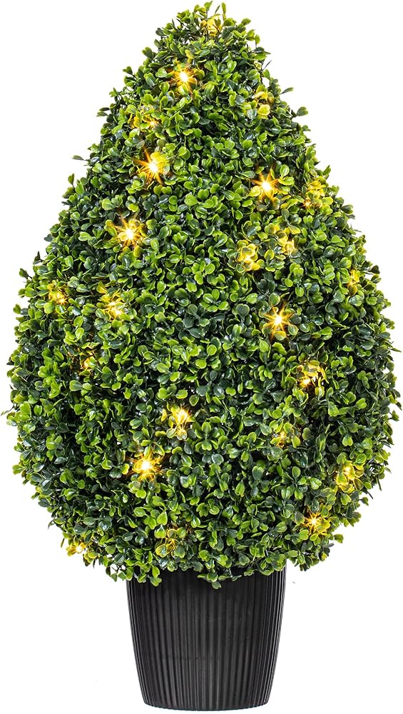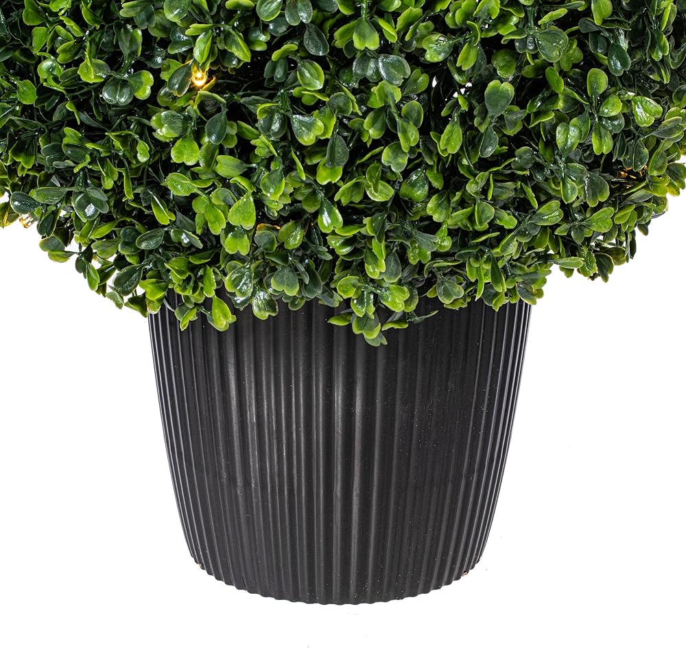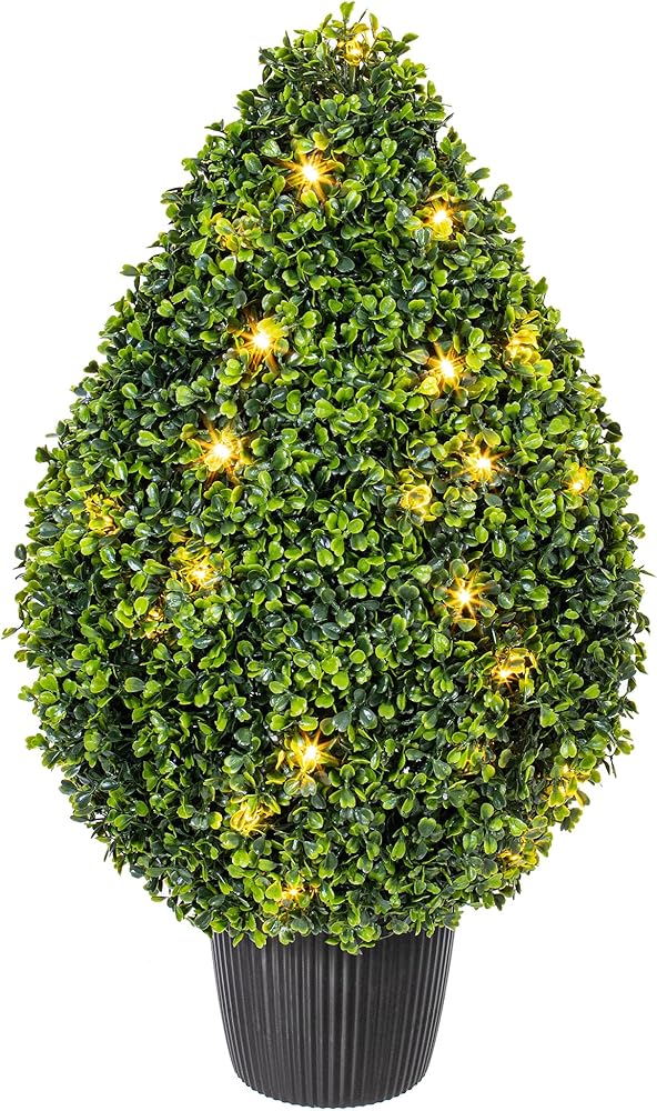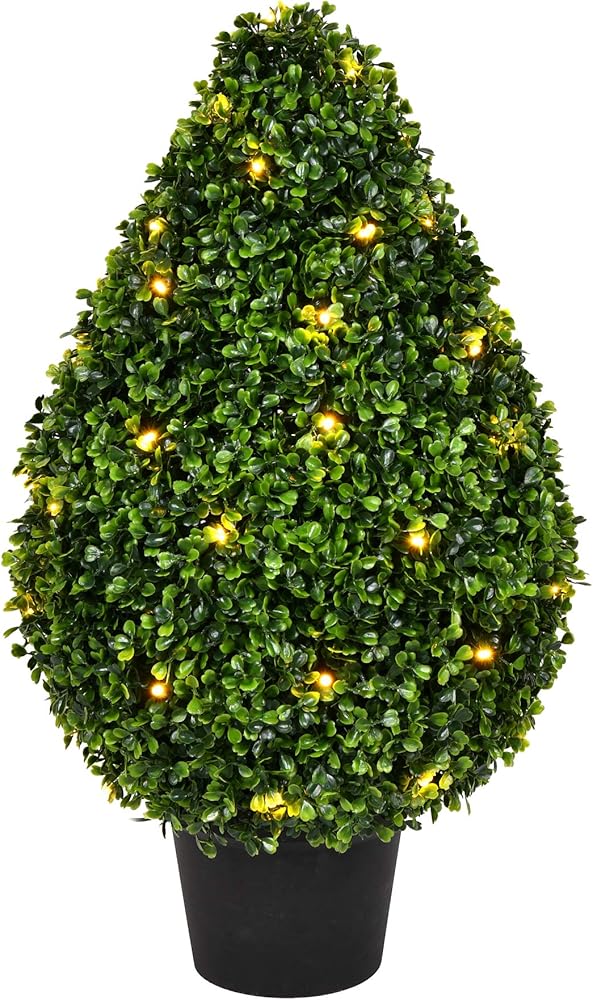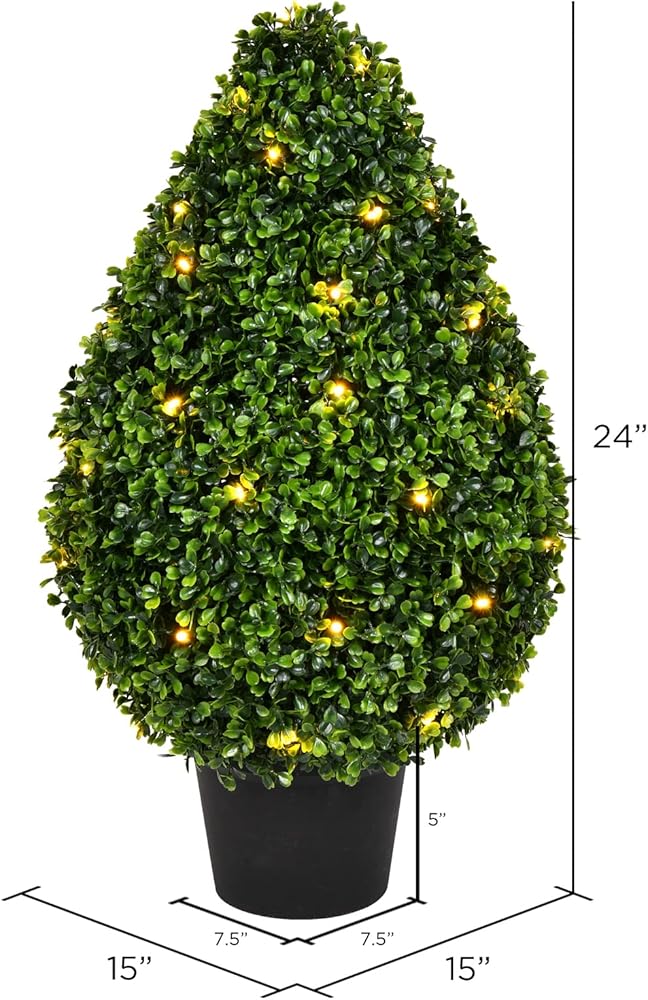 Vickerman Artificial 24" High X 15" Wide Boxwood Teardrop Shaped Bush is UV Resistant, Comes In A Black Plastic Insertable Pot, Making This Plant Easy To Place In The Decorative Container Of Your Choice. Pot measures 5" high x 7.5" in Diameter. This artificial topiary is wrapped with 50 warm white 3mm LED lights.
