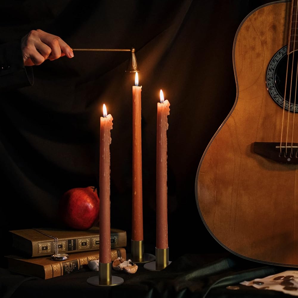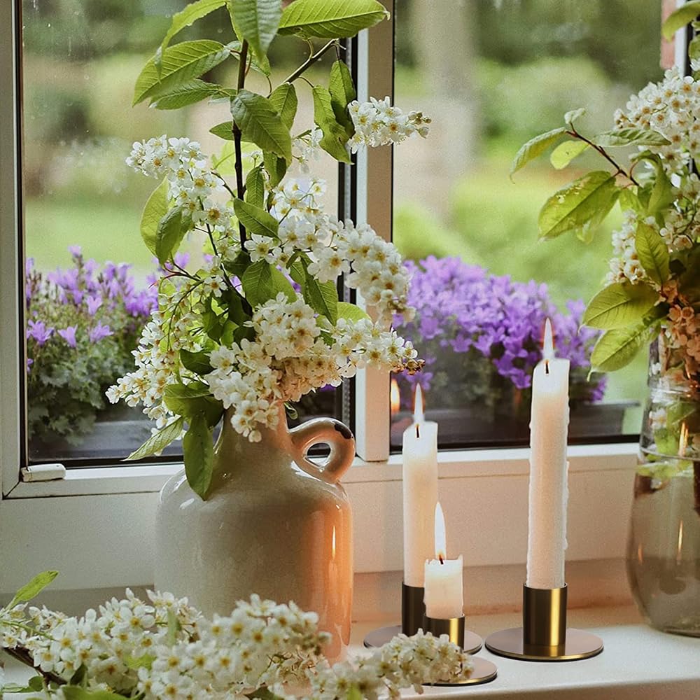 • These classic faux brass taper candleholders will look stunning on your kitchen or dining table. Their elegantly simple vintage inspired lines will work seamlessly with nearly any tabletop décor. And lets not forget the romantic mood they'll create once you light the candles. Just add some delicious food, a Pinot noir, and great company to complete the occasion