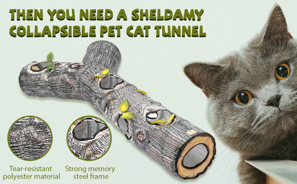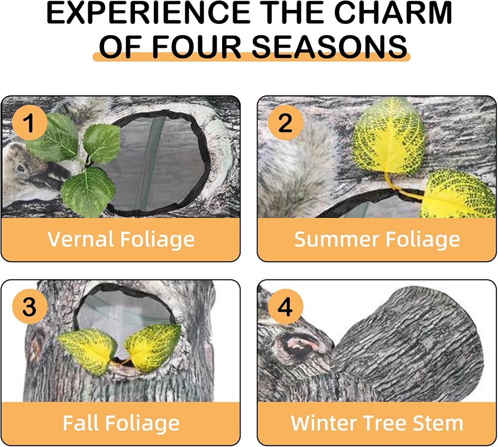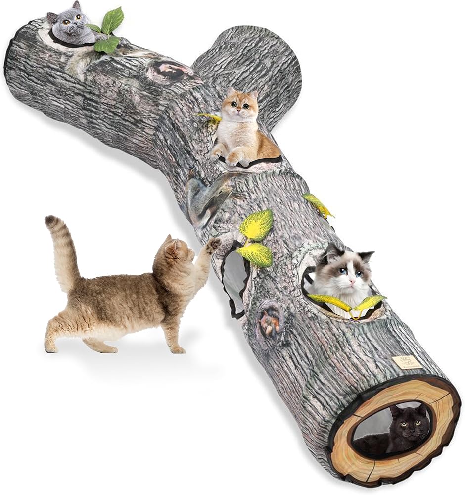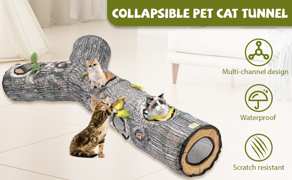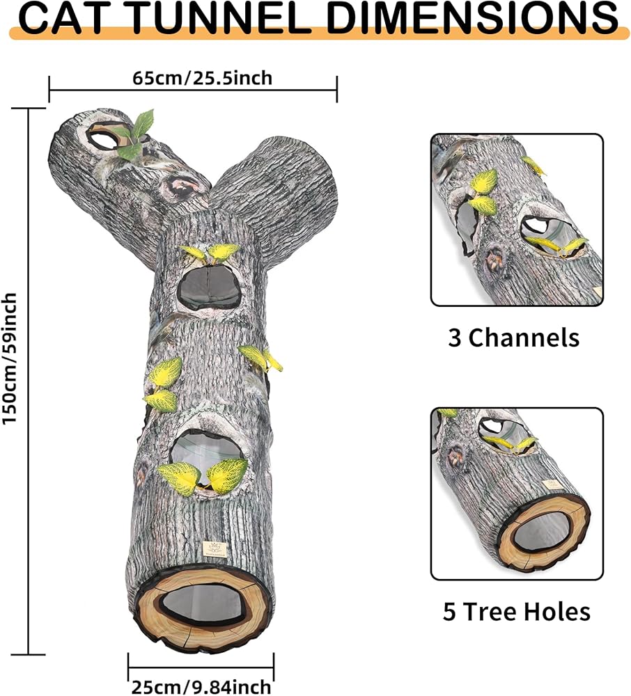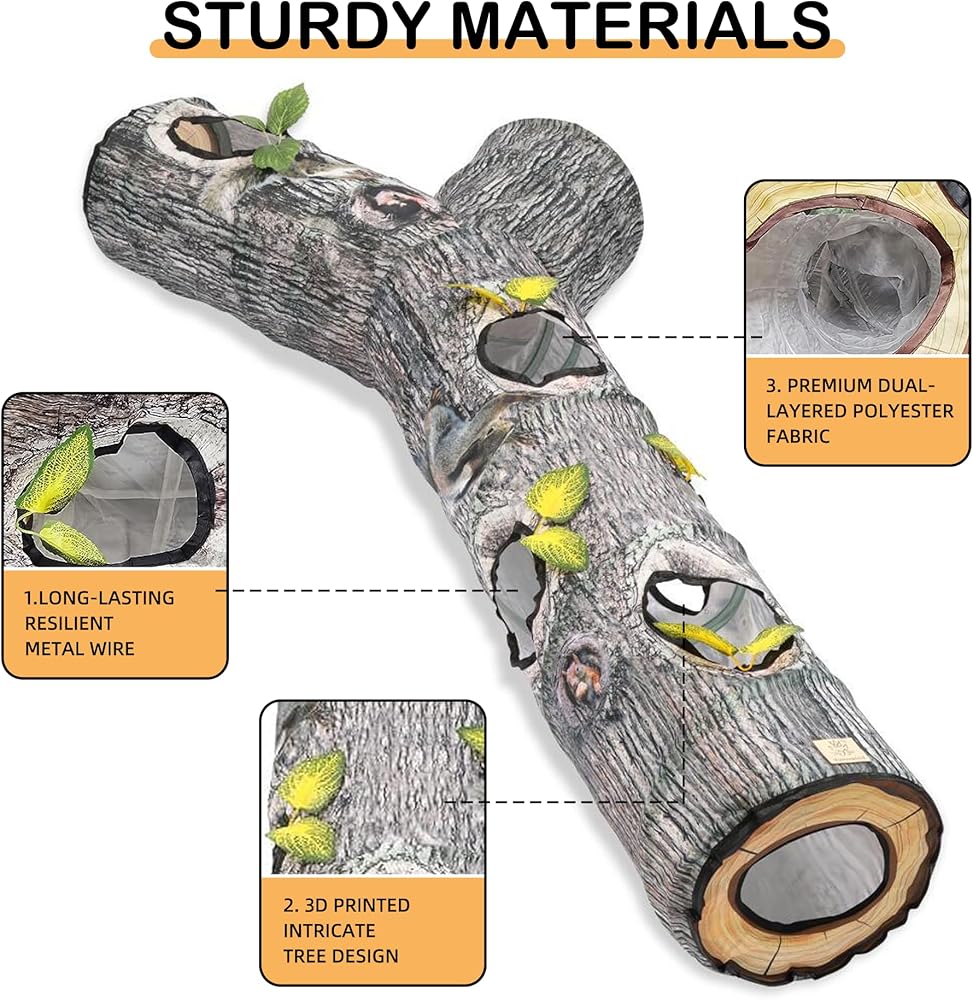 رؤية حقيقية: يعتمد نفق القطط على لون نمط شجرة اصطناعية لجعل الرؤية العامة للمنتج أكثر واقعية وجمالاً. التصميم المطابق لثقوب الشجرة والأوراق يجعل القطة تشعر بمزيد من الواقعية وتلعب ألعاب الصيد بجنون.