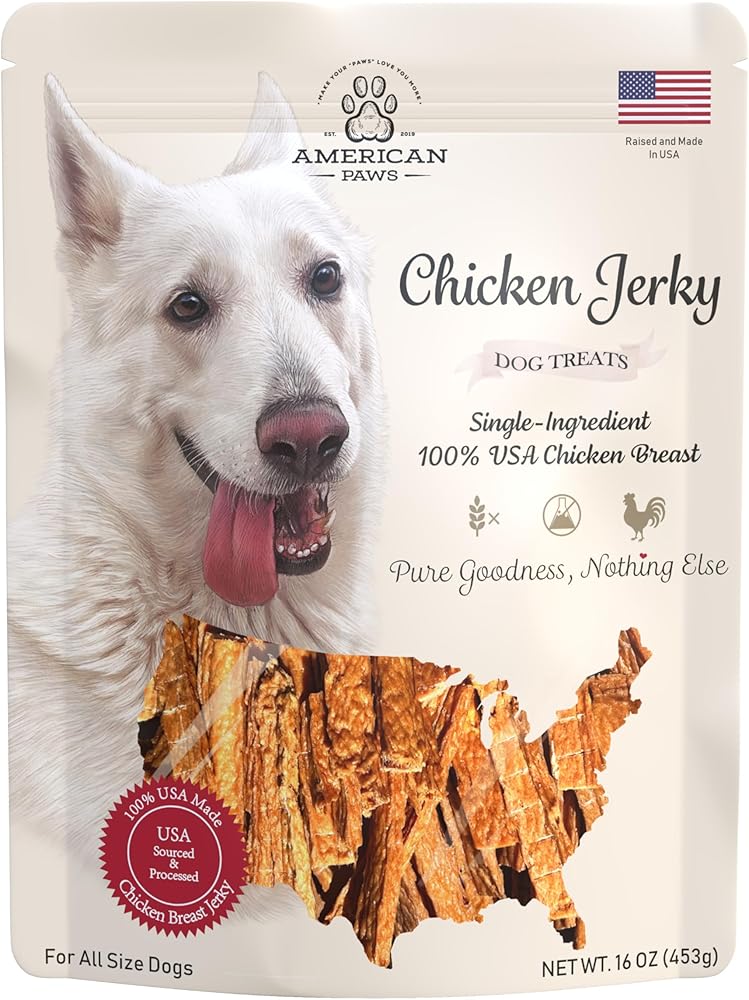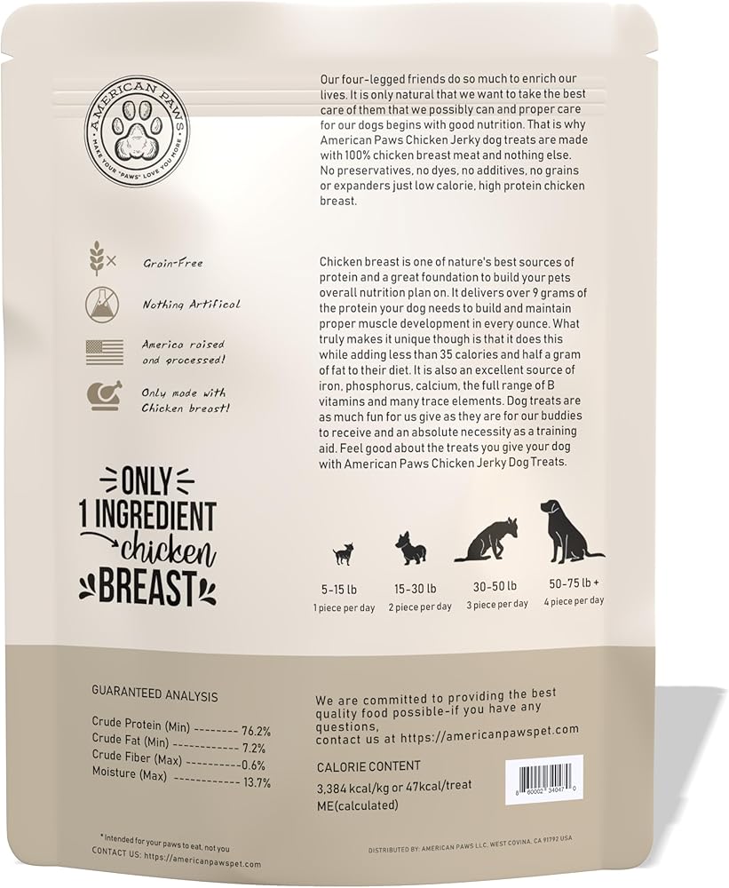 Treat your pup to fresh, delicious At American Paws Natural Chicken Jerky Dog Treats for All Size Dogs. Our all-natural dog treats are made with the highest quality ingredients and only USA-sourced chicken, so you know your pup is getting the best. These yummy jerky treats provide high-quality nutrition in every bite that will leave them asking for more. No matter what size your pooch is – small, medium or large – our Chicken Jerky Dog Treats provide great tasting goodness they'll love! Packed with protein, these nourishing jerky treats are full of flavor that dogs cant resist. Formulated to be healthy and delicious without any added fillers or artificial ingredients, these all-natural canine snacks offer a guilt-free indulgence for your furry family member. Plus, the resealable 1lb bag makes it easy to grab a few before going for a walk or playing at the park. So why not show your pup some extra love and support their overall wellness with American Paws Natural Chicken Jerky Dog Treats? American Paws Natural Chicken Jerky Dog Treats are the perfect choice when looking for nutritious eats tailored to your pooch's size and needs. You can feel good about giving them snacks you'd feed your own family because our chicken jerky treats are made right here in USA. So don't just think outside the box for tasty treat options – think inside of it with American Paws Natural Chicken Jerky Dog Treats!