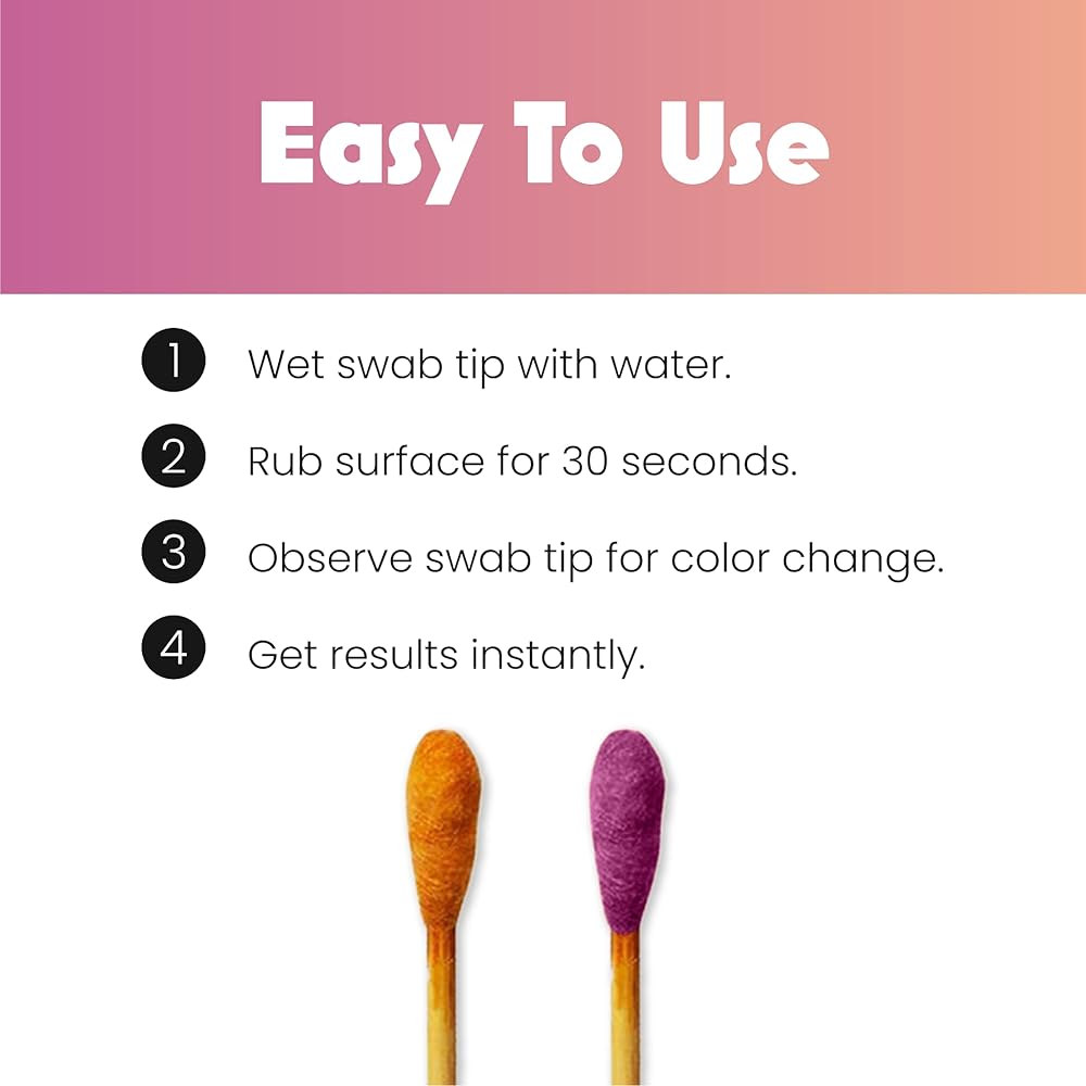 • سهل الاستخدام - استخدام مجموعة الاختبار الخاصة بنا لا يمكن أن يكون أسهل - ما عليك سوى غمس مسحة في الماء وفركها على المادة التي ترغب في اختبارها. وبعد لحظات ستحصل على النتيجة. يتم تحديد النتيجة حسب لون المسحة بعد فركها على السطح.