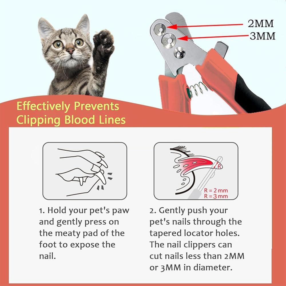 NEW SAFETY CAT NAIL CLIPPER - This new safety round hole cat nail clipper is the latest upgrade. Traditional scissors need to be well secured to your pet and can only be clipped at a certain angle to complete. But our round hole cat nail cutters are cleverly designed to allow you to clip safely at any angle. Simply place the nail into the appropriate hole and it will cut the nail nicely.