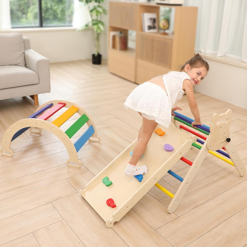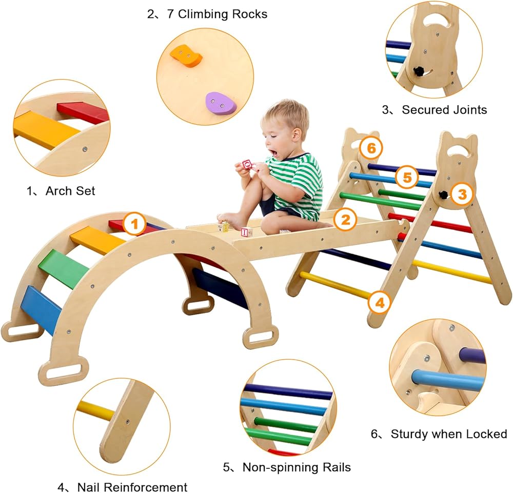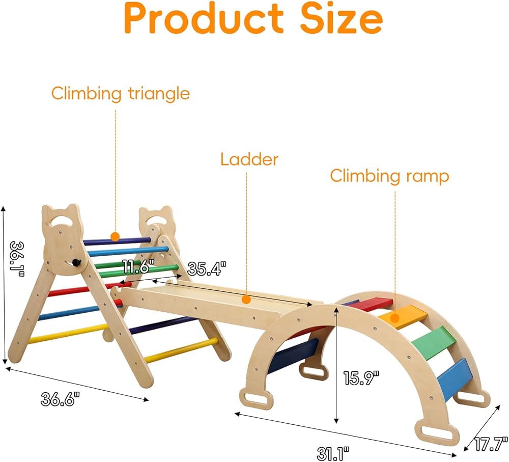 مجموعة مثلثات بيكلر 3 في 1 من Ymonlia، مثلث تسلق مونتيسوري مع منحدر وقوس مع منزلق، مجموعة ألعاب تعليمية لصالة الألعاب الرياضية للأطفال في الأماكن المغلقة والمفتوحة، صالة ألعاب رياضية للتسلق مونتيسوري للأطفال 1-6 (ليست وسادة إسفنجية)
