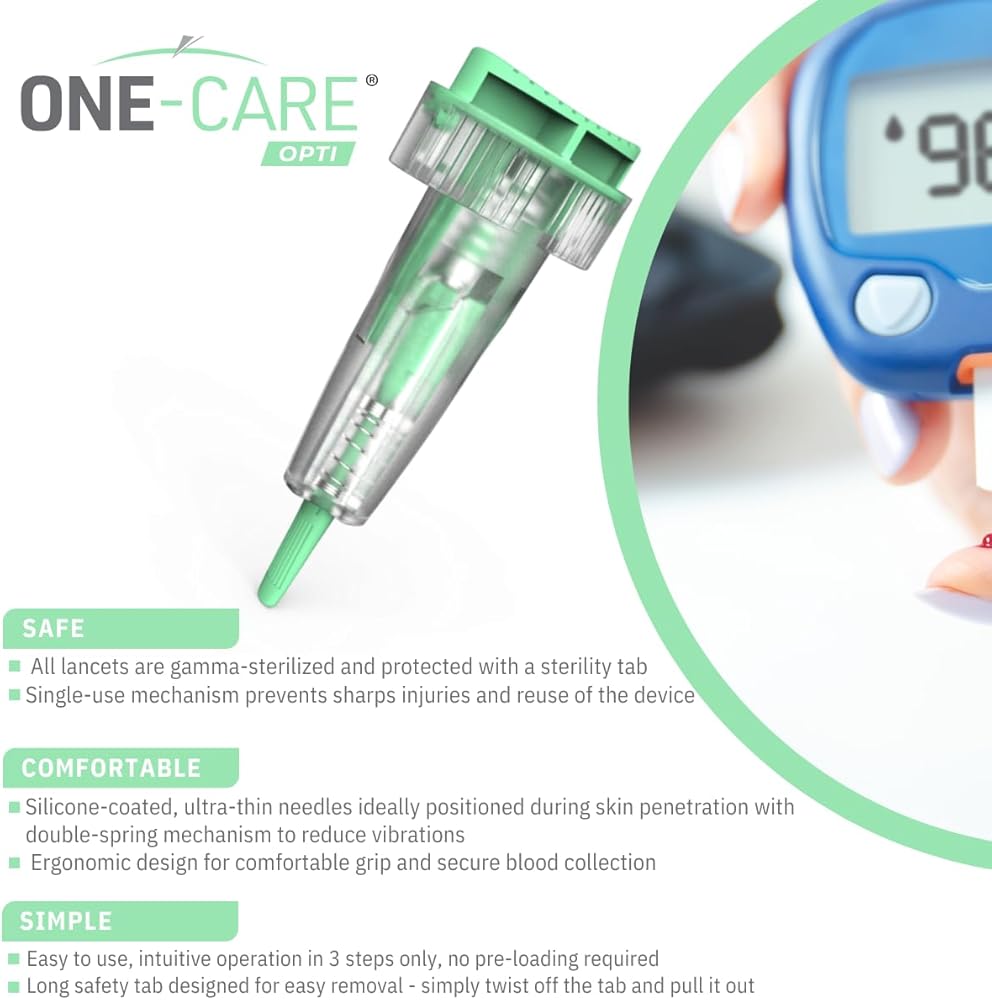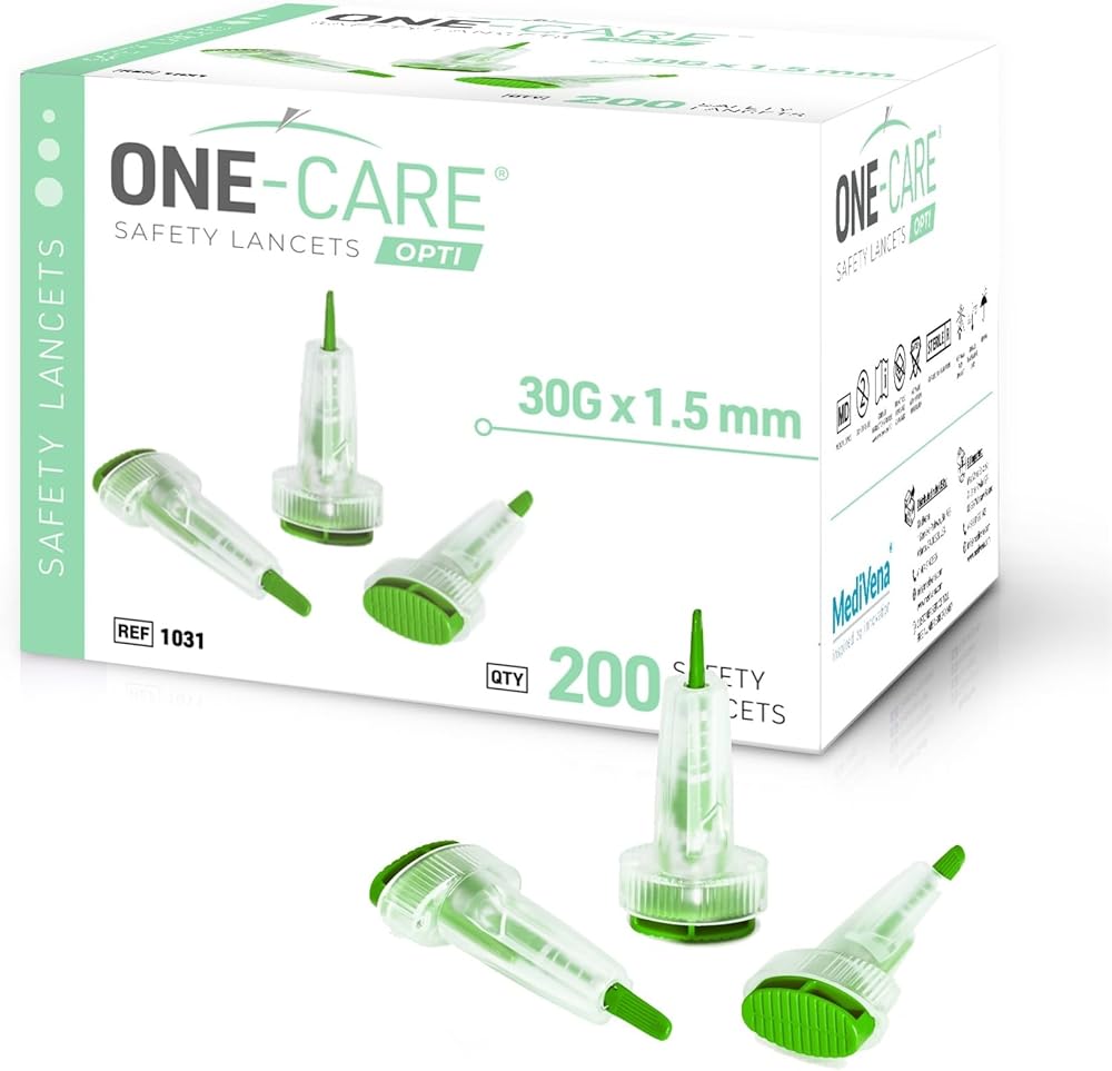 200 عدد: مشارط أمان ONE-CARE Opti، زر علوي مفعل، 30 جم × 1.5 مم، قابل للسحب تلقائيًا، معقم، للاستخدام الفردي، مثالي لاختبار الدم، رفيع للغاية لتوفير الراحة