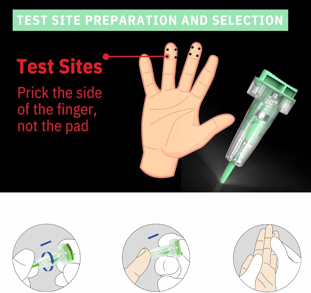 ONE-CARE OPTI Push Button Activated Safety Lancets offer excellent ergonomics with T-shape main housing, comfortable wings and concaved button for stable grip within the hand and easy activation. ONE-CARE OPTI Safety Lancets feature long and wide safety tab for convenient twist off and pull out, optimized skin contact area of round shape for convenient placement on the test site, low trigger force for convenient activation. Dual-spring mechanism allows for quick and gentle puncture for enhanced comfort. Automatic and reliable needle retraction helps protect against accidental needlestick injuries. Built-in needle depth control provides for consistent and accurate sampling results. STEP 1 Twist off the safety cap by a full turn of 360 degree, then pull it out, STEP 2 Press the top push button to activate the device, STEP 3 Collect blood sample and dispose the safety lancet into sharps container.
