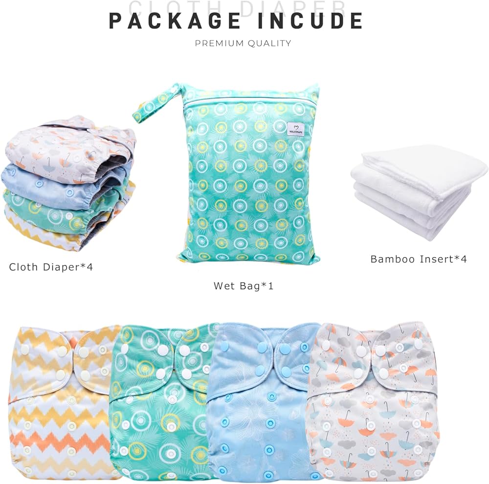 Each package will come with 4 pcs pocket diapers, each diaper include a soft bamboo insert. Besides, you will obtain a wet bag with large space, enough to put about 5-7 cloth diapers.