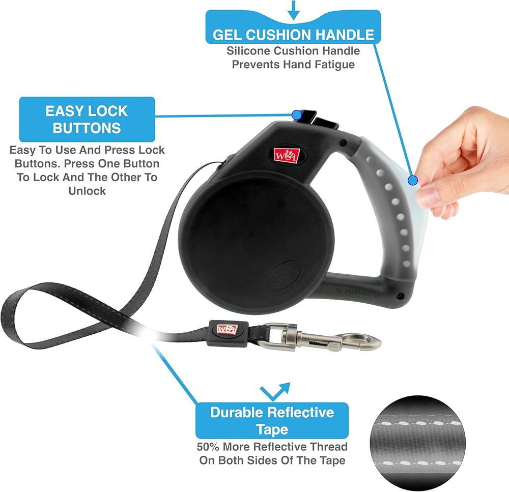 يحتوي زمام الجل القابل للسحب العاكس ويجزد على مقبض مملوء بالجل السائل الذي يتوافق مع يدك للحصول على أقصى درجات الراحة. كما أنه يسمح لك ولحيوانك الأليف برؤية ليلاً بسبب الشريط العاكس الساطع المذهل. ستستمتع أيضًا بسحب سلس وأزرار سهلة الاستخدام للتحكم في كلبك. هذا المنتج مصنوع من أجزاء عالية الجودة وسيدوم لسنوات. يوجد داخل كل سلسلة زنبرك من الستانلس ستيل لن يصدأ وسيستمر في التراجع لسنوات. يمكن للزنبركات المصنوعة من الستانلس ستيل أن تدور ذهابًا وإيابًا لأكثر من 100000 مرة من المطر أو اللمعان. يمكنك الوثوق بجودة وسمعة العلامة التجارية ويجزي لسنوات قادمة. الجل السائل بالداخل غير سام من أجل سلامتك أنت وحيوانك الأليف. أشرطة الرصاص العاكسة هي المعيار.