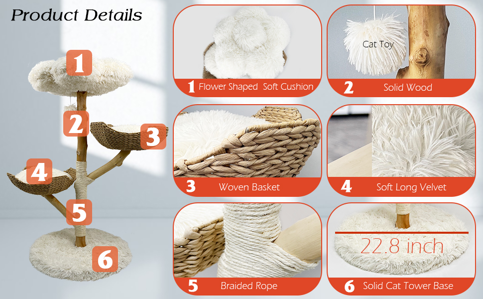 【معلمة شجرة القطط】من الأعلى إلى الأسفل: 45 بوصة. قطر القاعدة المستديرة: 22.8 بوصة. حجم وعمق عش القطط: 16.5 × 16.5 بوصة و6 بوصة. قطر السجادة على شكل زهرة: 21 بوصة. قطر الإطار الخشبي الصلب: 2.75 بوصة. المسافة بين عش القطط وحصيرة القطط مناسبة للقطط للتسلق والقفز.