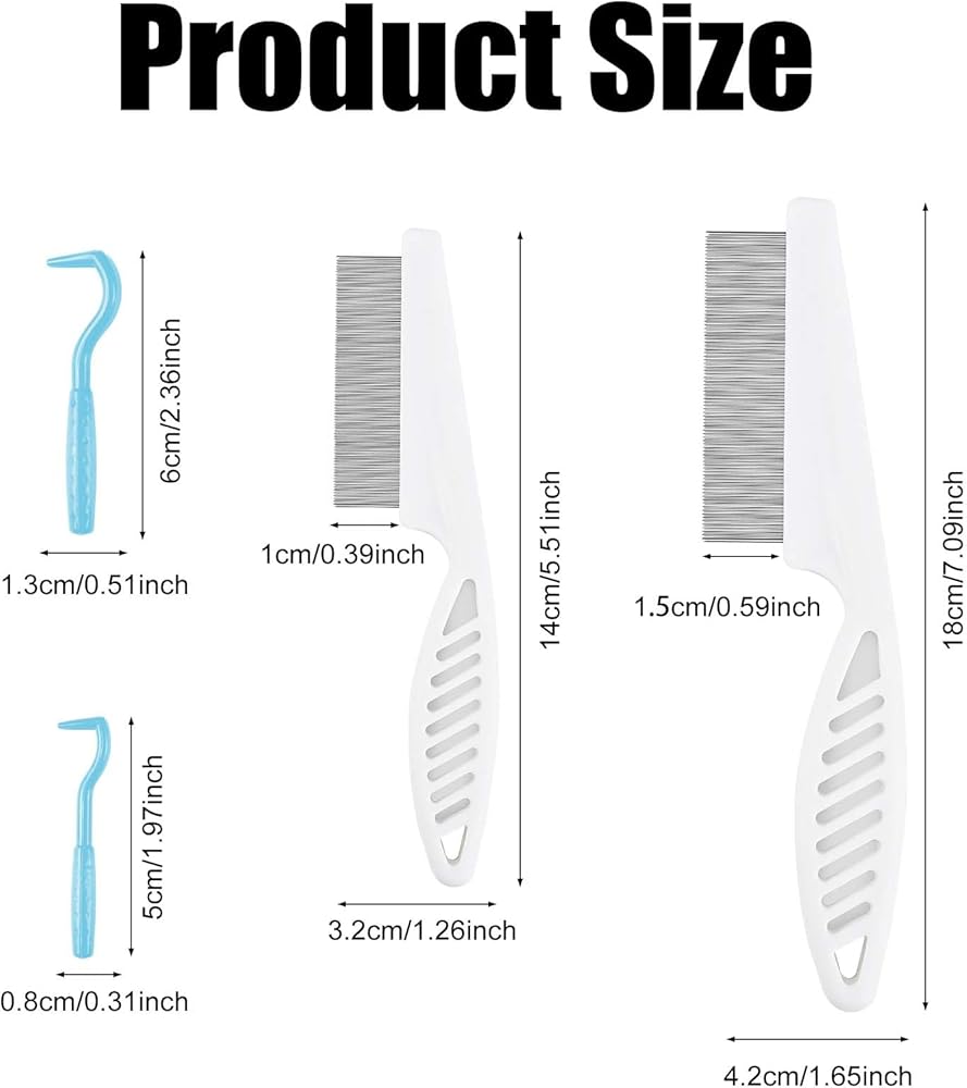 Product Size: pet comb: 18 x 4.2 x 1.5cm/7.09 x 1.65 x 0.59in and 14 x 3.2 x 1cm/5.51 x 1.26 x 0.39in, pet clips: 5 x 0.8cm/1.97 x 0.31in, 6 x 1.3cm/2.36 x 0.51in