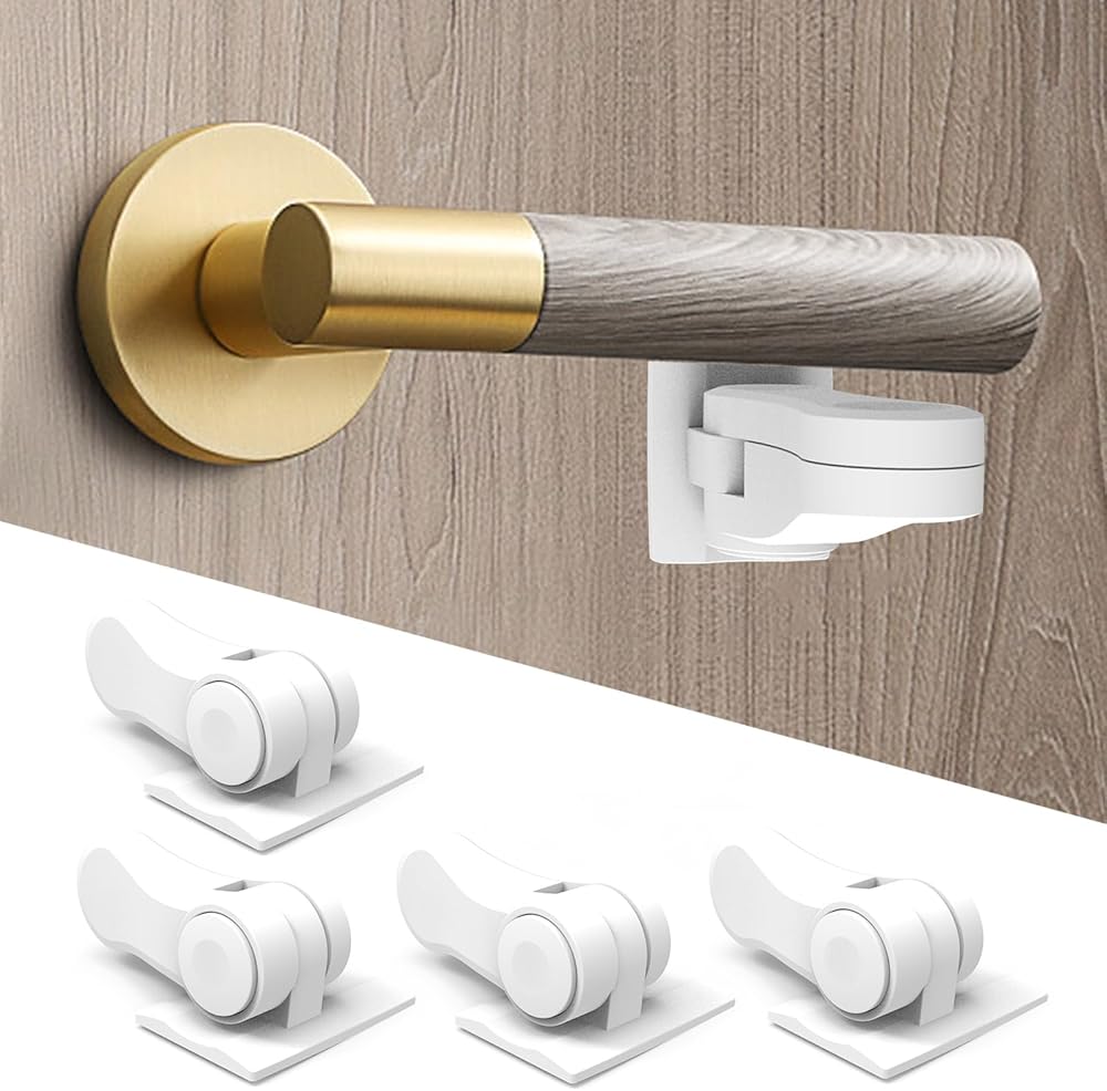 قفل مقبض الباب المقاوم للأطفال (4 عبوات)، قفل رافعة باب أمان الأطفال، مقاوم للأطفال والحيوانات الأليفة باستخدام لاصق 3M، لا حاجة للحفر، تصميم بسيط، تركيب بدون أدوات لسلامة الأطفال الصغار