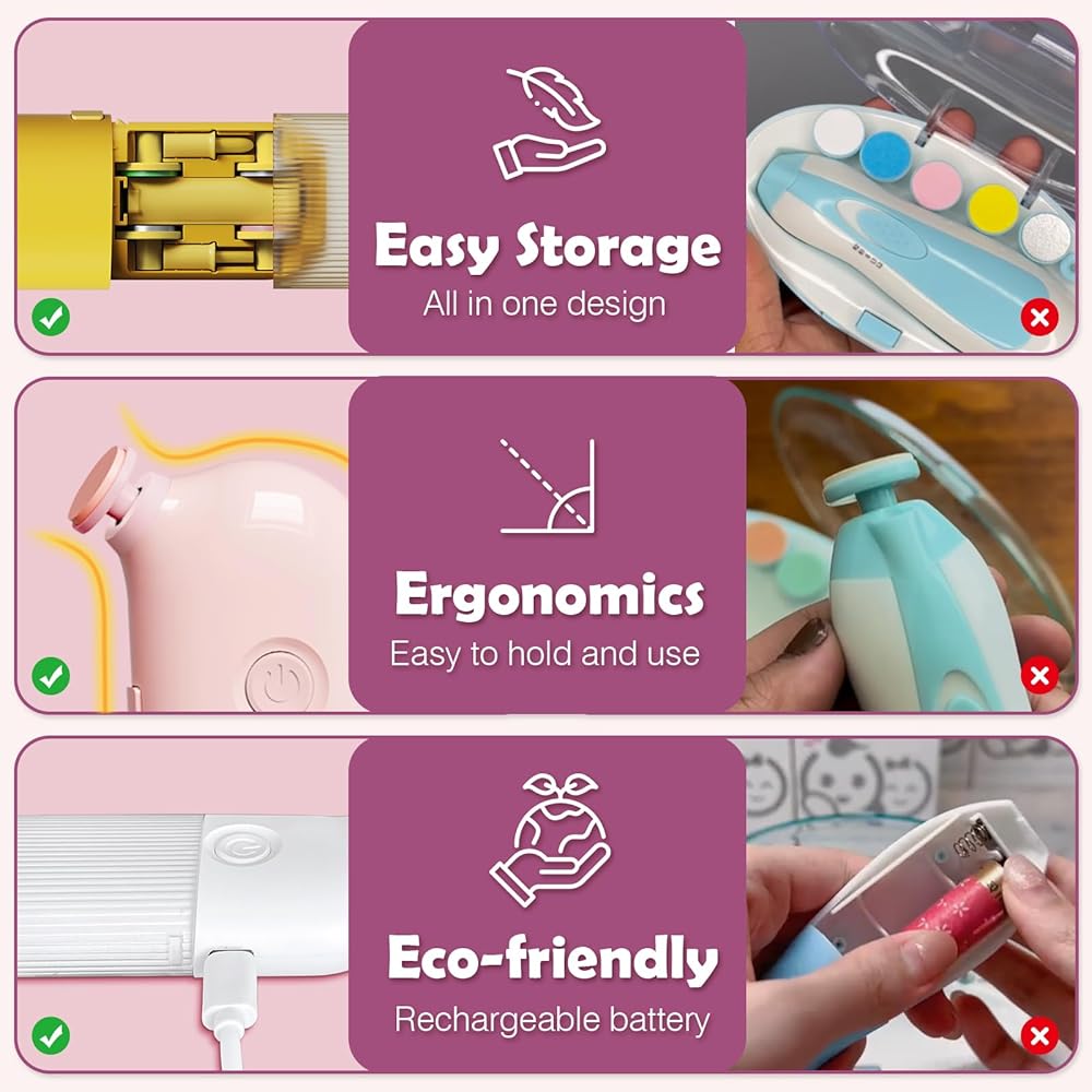 ❤️[قابل لإعادة الشحن وصديق للبيئة] يحتوي مبرد تقليم أظافر الأطفال على بطارية مدمجة. بالمقارنة مع مقصات أظافر الأطفال الأخرى ومقلمة أظافر الأطفال، فإن مبرد الأظافر القابل لإعادة الشحن الخاص بنا لا يحتاج إلى تغيير البطارية، ويتم شحنه باستخدام كابل عادي من النوع C (متضمن). متينة وصديقة للبيئة.