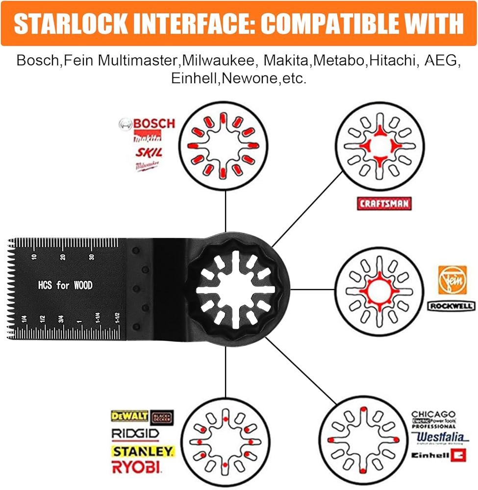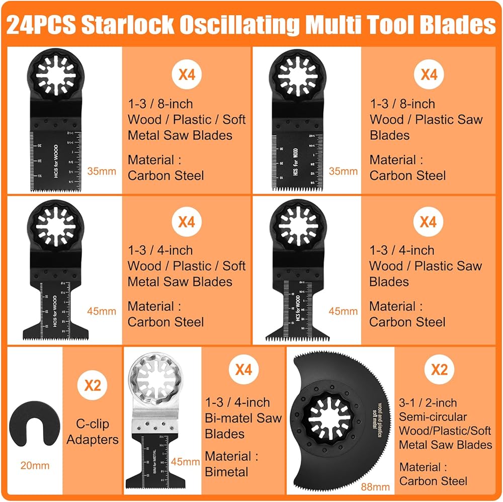 مجموعة شفرات متعددة الأدوات ذات التوافق العالمي: تحتوي شفرات ستارلوك المتذبذبة المكونة من 24 قطعة على 4 أنواع مختلفة من شفرات المنشار القياسية والدقيقة. تم تصميم الشفرات المتذبذبة الخاصة بنا لتكون متوافقة مع شفرات الأدوات المتذبذبة من بوش ومجموعة واسعة من العلامات التجارية الأخرى. تأكد من ملاءمة سلسة مع أدواتك من أجل قطع سريع ومستقر ودقيق. إذا كانت لديك أي مخاوف بشأن التوافق، فنحن هنا للمساعدة!