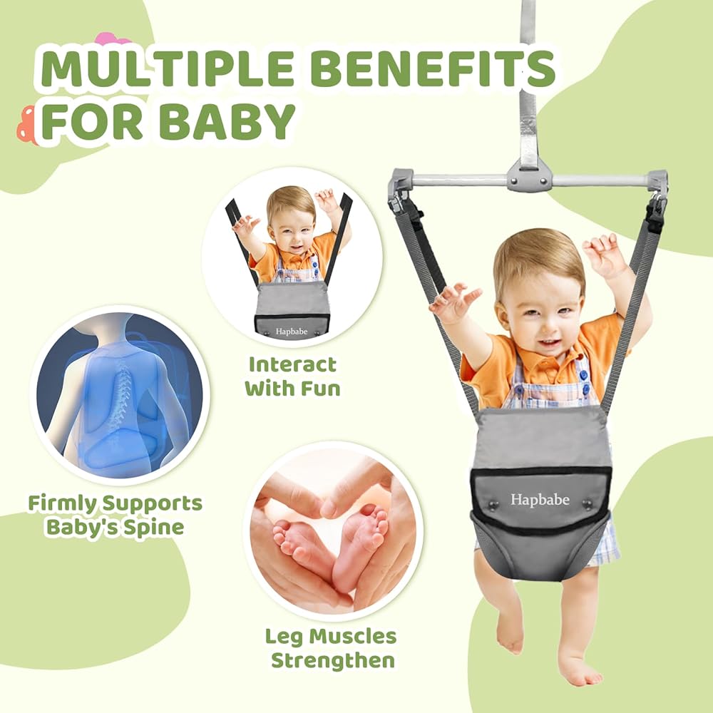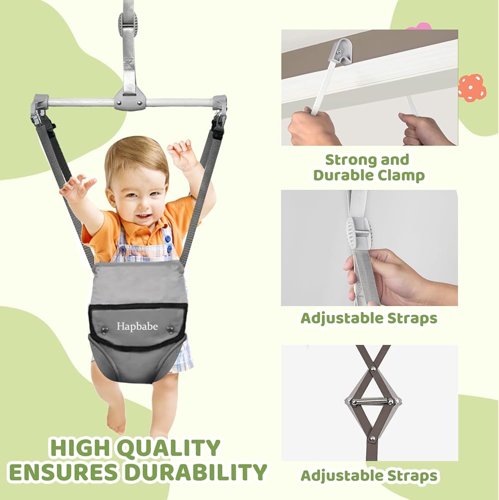 يتم تثبيت مشابك دعامة قوية بشكل آمن على المداخل. زنبرك حارس عالي الجودة مع سلك أمان مخفي لمزيد من الأمان. أحزمة قابلة للتعديل وحقيبة مقعد صديقة للبشرة تحافظ على راحة الطفل أثناء الاستمتاع بالقفز.
