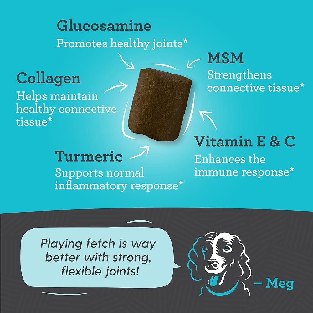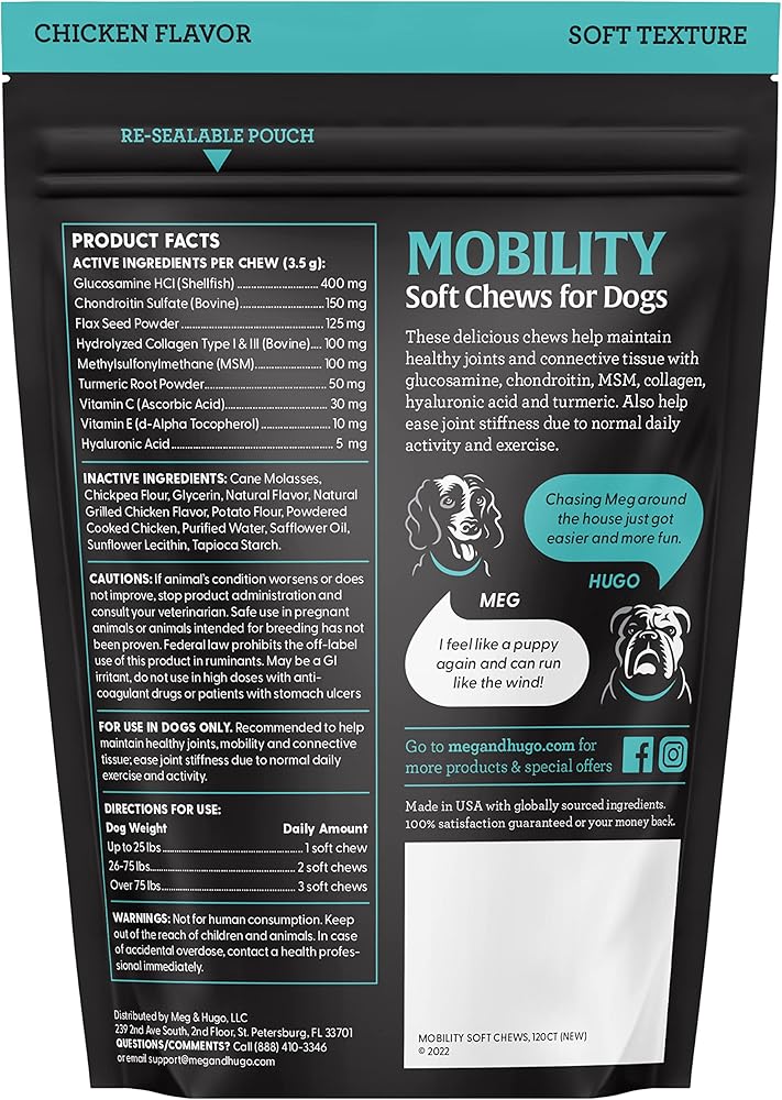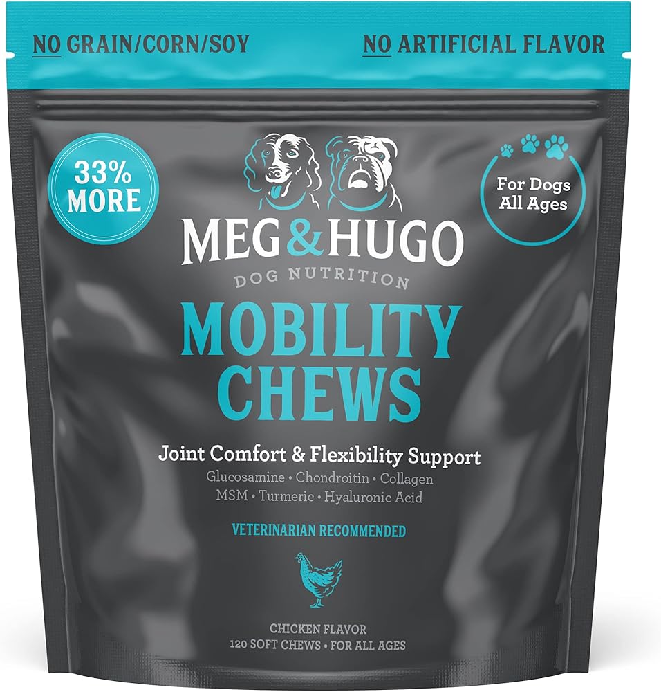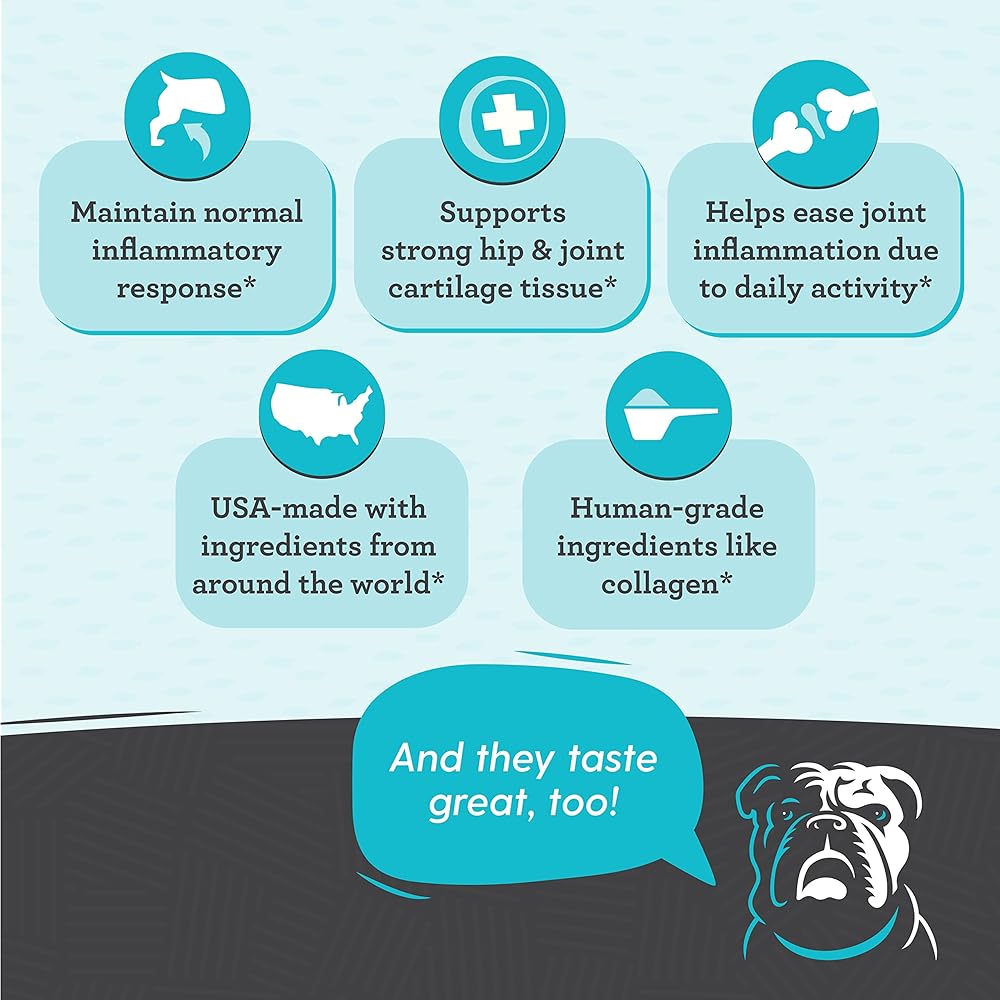 مكمل الورك والمفاصل للكلاب، 33% أكثر، 120 قطعة مضغ ناعمة للحركة، جلوكوزامين كوندرويتين، كولاجين، كركم، حمض الهيالورونيك، بذور الكتان، فيتامين C وE، للسلالات الصغيرة والكبيرة، يوصى به من قبل الطبيب البيطري