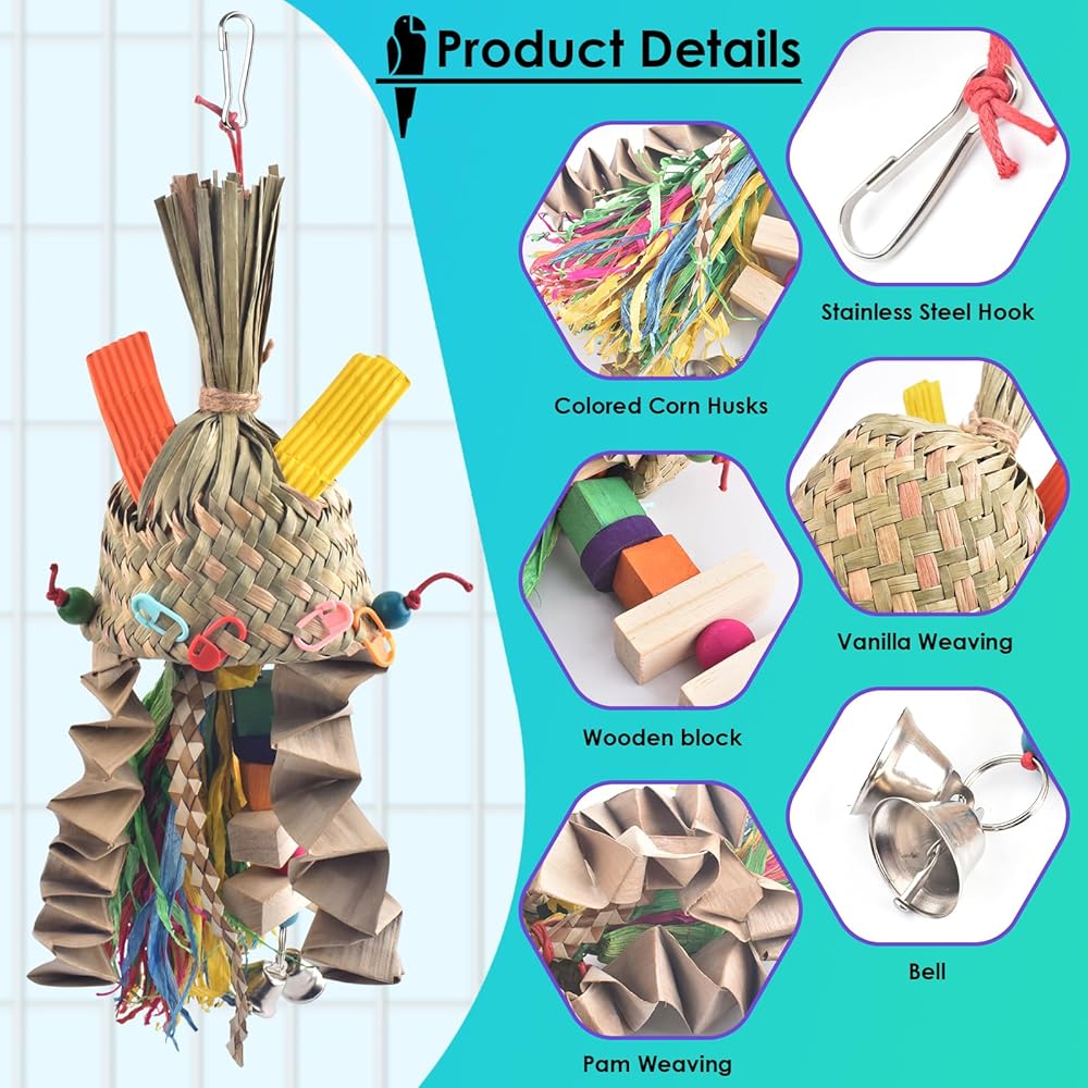 NATURAL & HANDMADE: Parrot toy is handmade of natural vanilla weaving, colored corn husk, wooden block, palm weaving to make them more bite resistant and durable, let your pet safe to chew and play