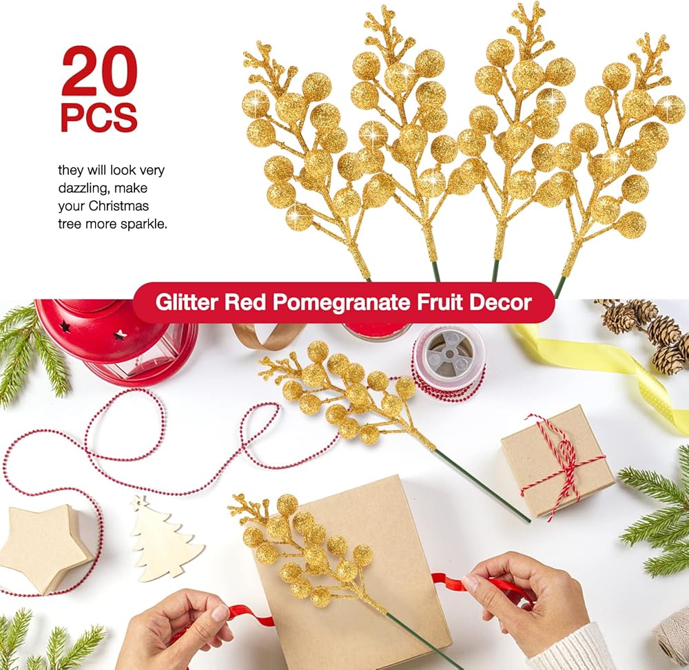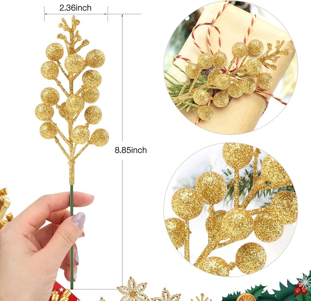 مادة عالية الجودة: سيقان التوت اللامعة النابضة بالحياة لعيد الميلاد مصنوعة من إسفنج عالي الجودة وسلك حديد، والسطح عبارة عن طبقة من مسحوق الذهب اللامع، بألوان زاهية وجميلة. أضف القليل منها إلى تنسيقات زهور عيد الميلاد الخاصة بك، أو أكاليل الزهور البسيطة، أو الأكاليل، أو أشجار عيد الميلاد، وامنحها إضاءة المسرح لجعلها تتألق.