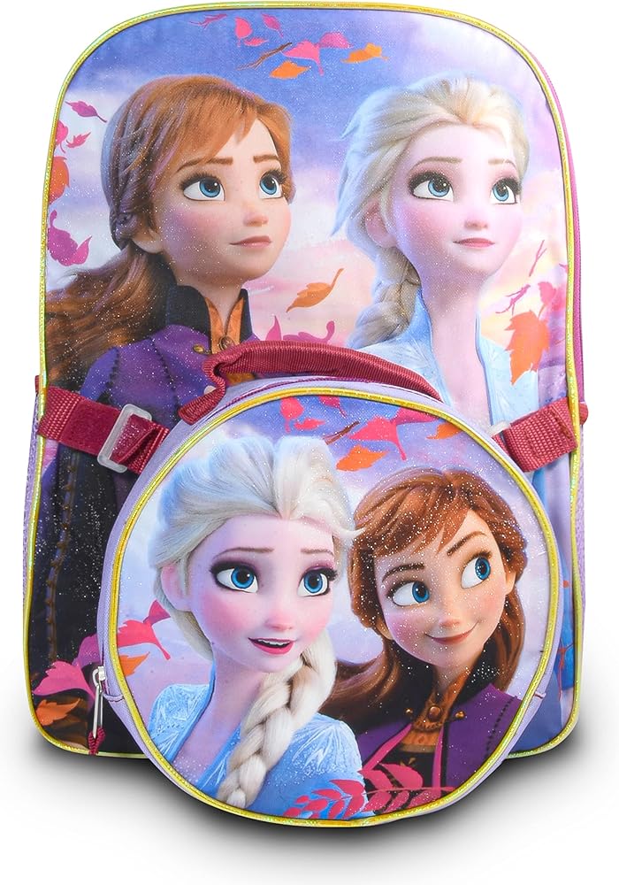 مثالية لأي من محبي فروزن، تتميز مجموعة حقائب فروزن المدرسية هذه بعمل فني خريفي ملون يضم آنا وإلسا.