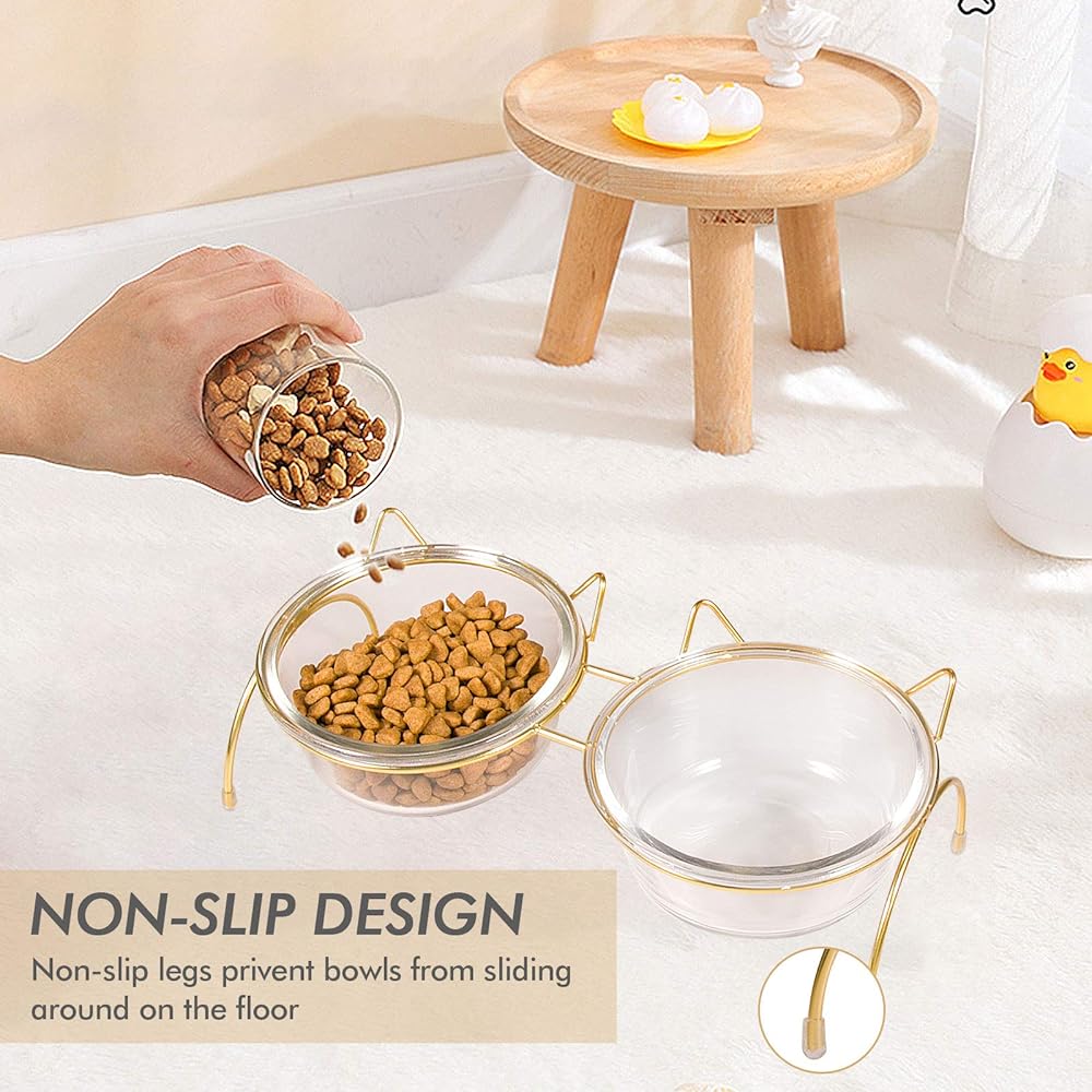 • 【Generous Capacity & Enhanced Stability】: Each set includes two glass bowls, offering a large capacity of 17 ounces for both food and water. The non-slip sleeves are provided pre-fitted on the four legs of the cat bowl stand, ensuring stability and preventing any unwanted sliding or tipping during mealtime.