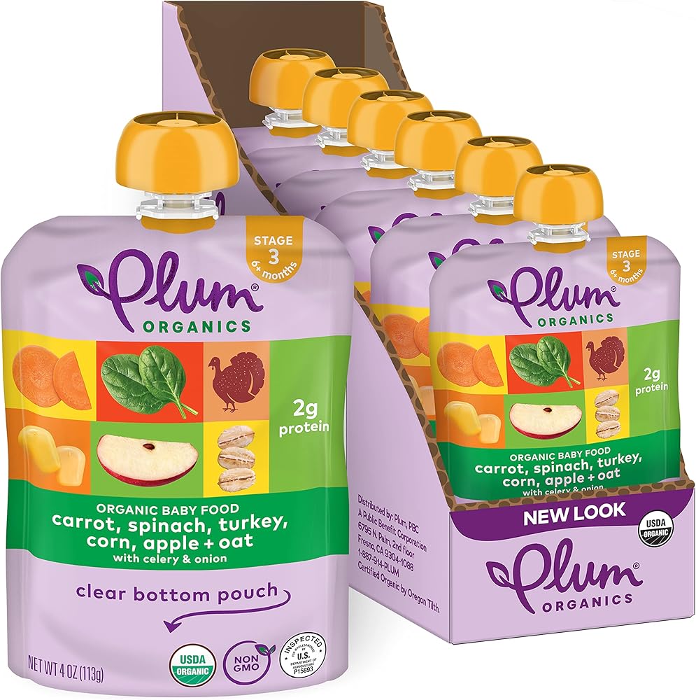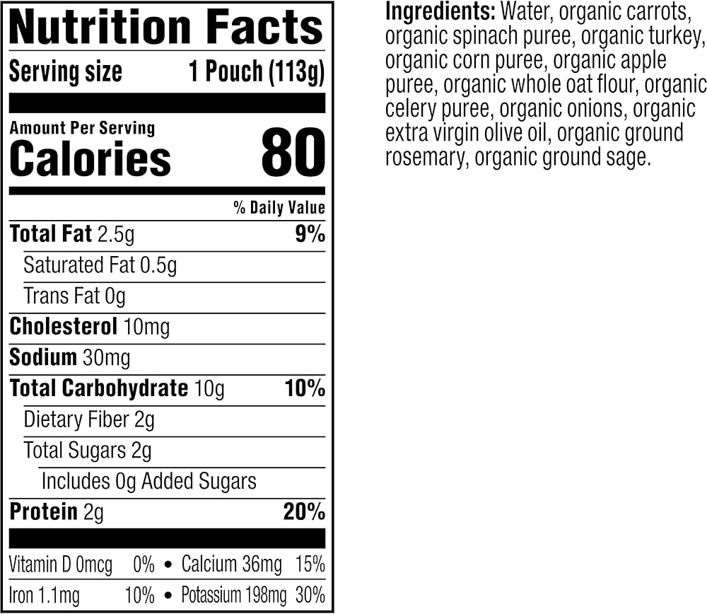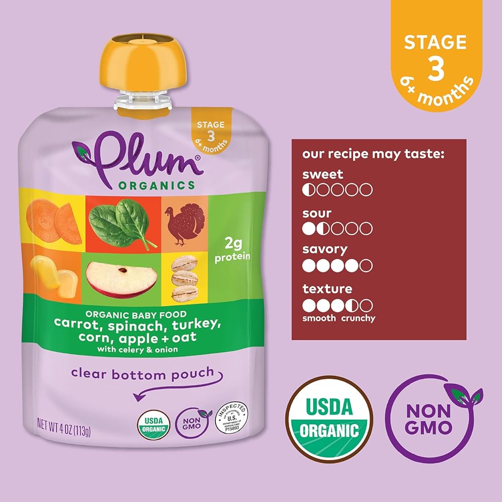 Organic Baby Food Puree with Carrots & Turkey: Certified organic & non-GMO project verified, with 3 grams of protein per pouch from a blend of Carrot, Spinach, Turkey, corn, Apple & Potato
