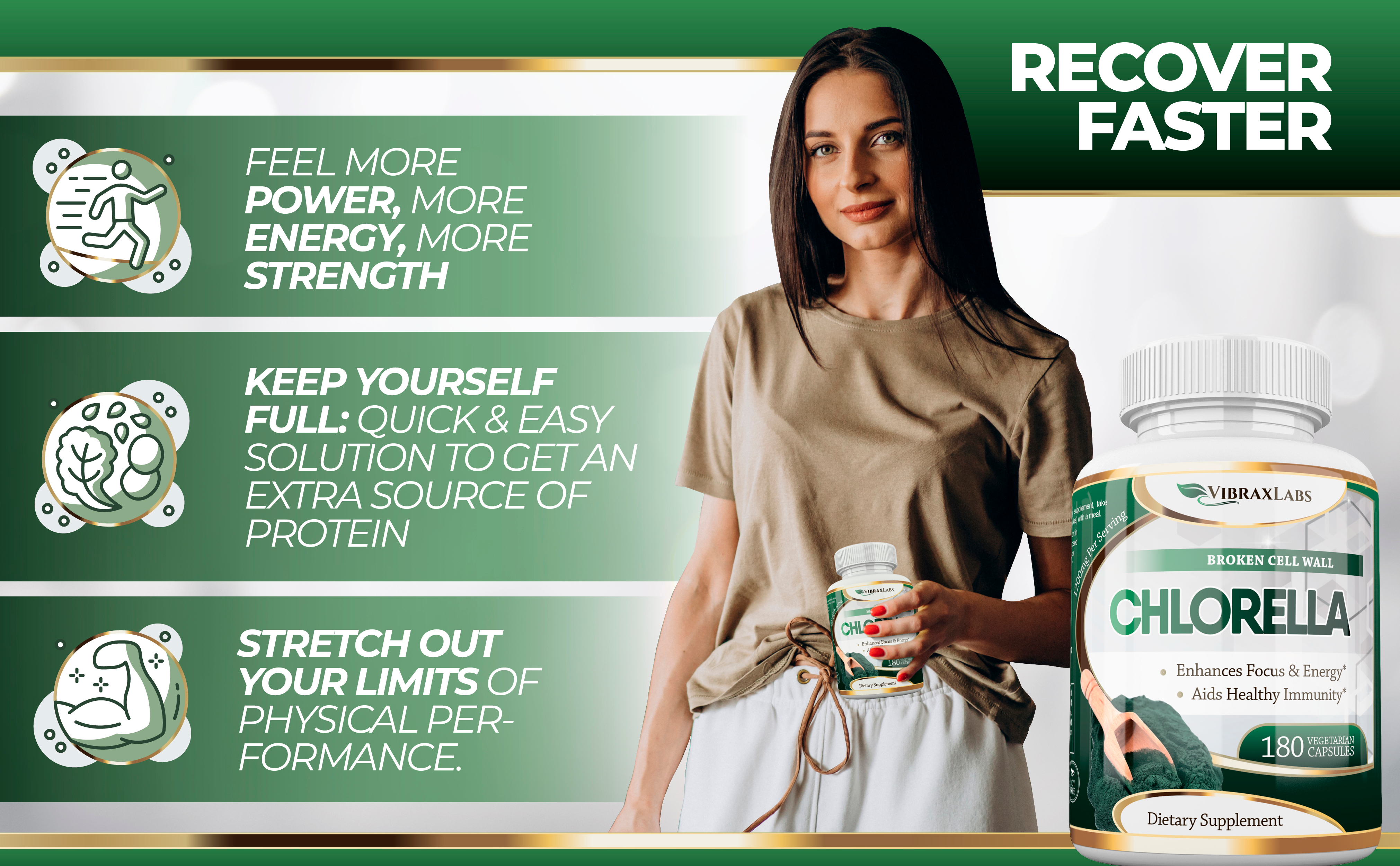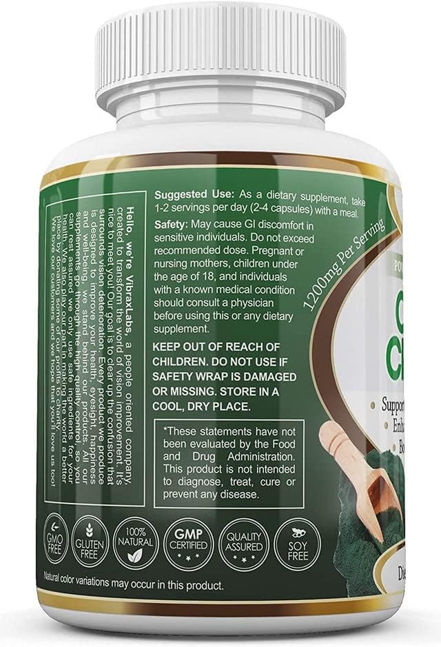 جودة عالية: نباتي آمن. من السهل جدًا تناوله ولا يوجد به مذاق. لقد قمنا بتغليف جرعتك اليومية من مسحوق الكلوريلا الطازج في أغطية نباتية سهلة البلع حتى لا تترك بقعًا خضراء مروعة في أسنانك ولا تترك أي مذاق. بالإضافة إلى أن كل زجاجة تخضع لمراقبة صارمة للجودة ويتم تصنيعها في منشأة معتمدة بجودة GMP في الولايات المتحدة الأمريكية ويتم إنتاجها من مياه نقية غير ملوثة في الولايات المتحدة الأمريكية. خالي من المعادن الثقيلة والإشعاعات وغير المعدلة وراثيًا وخالي من الغلوتين.