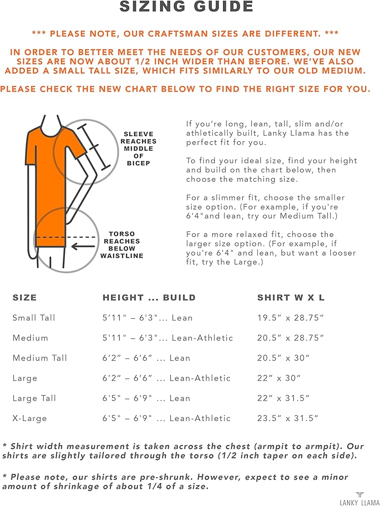 • PLEASE NOTE Our Craftsman sizes are about 0.5 inches wider than our Legends Tees. Please check the size chart for guidance.