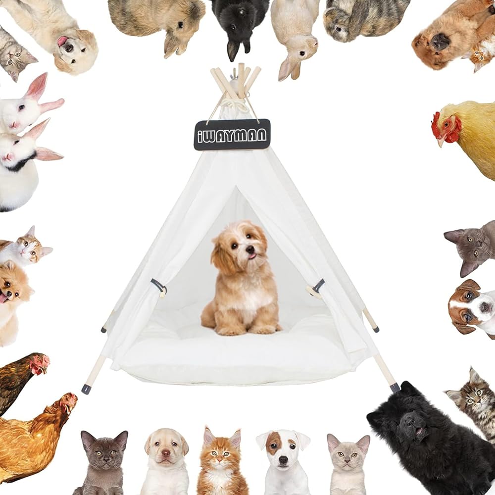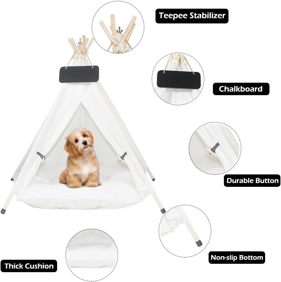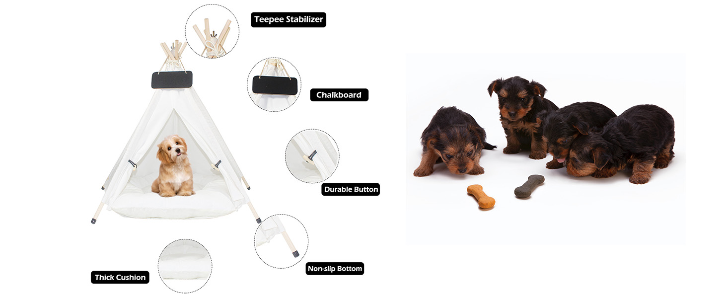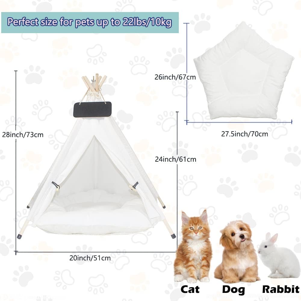 🐼Size and Package :24 inches high and 20 inches in diameter. Suitable for 22lb / 10kg pets, comes with 1 cotton tent, 1 cushion, 1 tent stabilizer, 5 pine poles, 5-10 silicone non-slip foot covers, 1 chalkboard, and 1 installation manual.