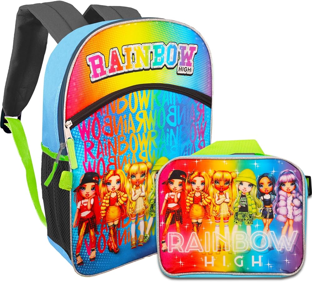 تتضمن مجموعة لوازم المدرسة الثانوية بألوان قوس قزح حقيبة ظهر واحدة مقاس 15 انش مع أحزمة كتف قابلة للتعديل وحلقة علوية للتعليق وحقيبة غداء مستطيلة واحدة، تتميز كل منها بشخصيات رينبو هاي المفضلة بما في ذلك البنفسجي وسكايلر واليشم.