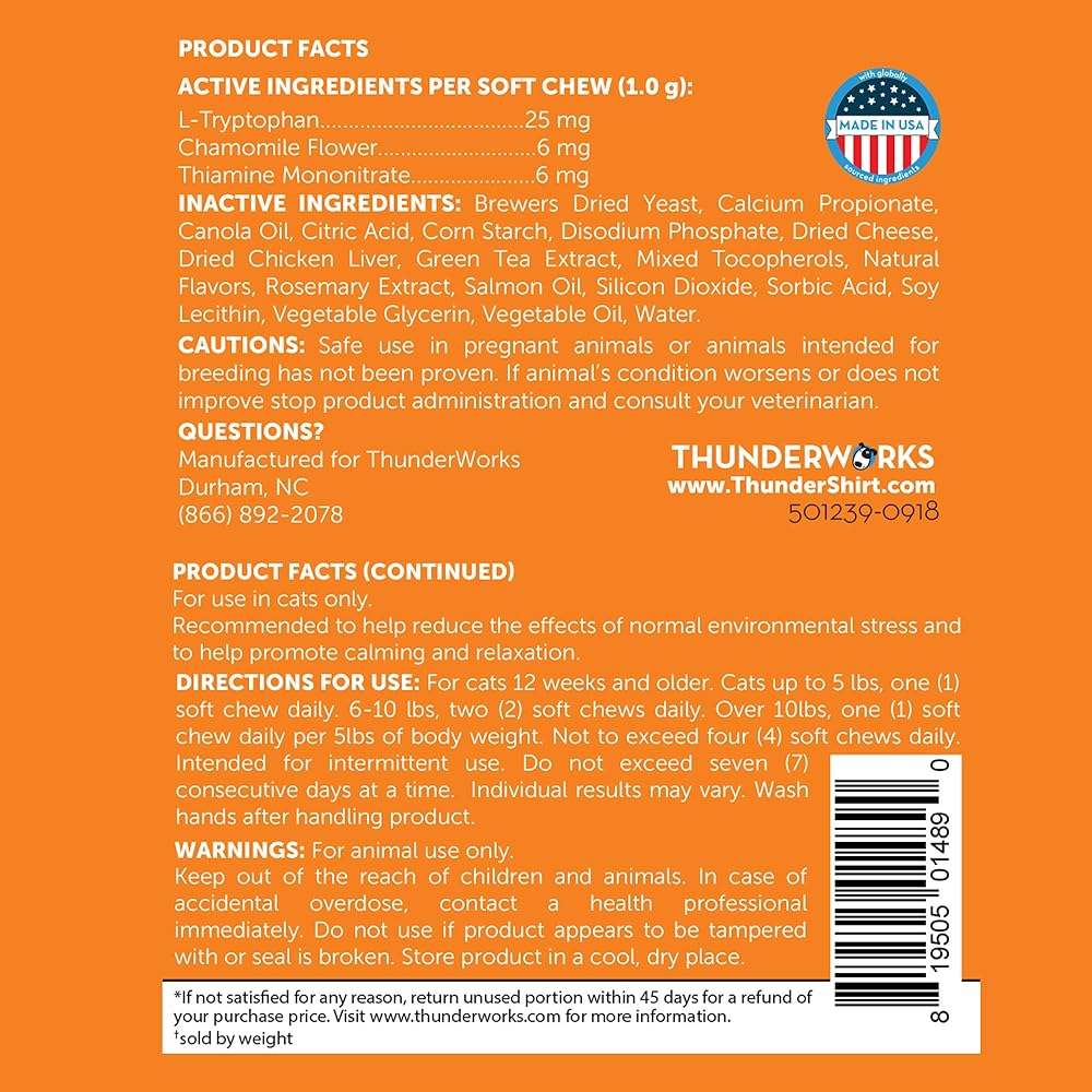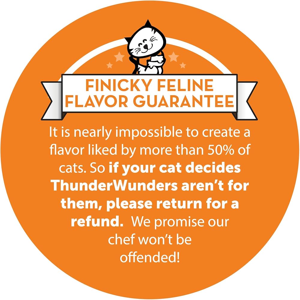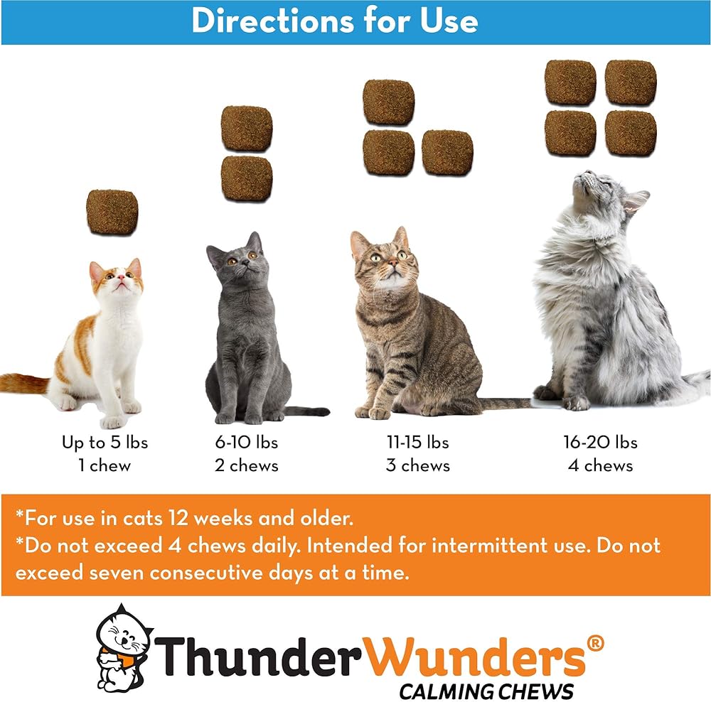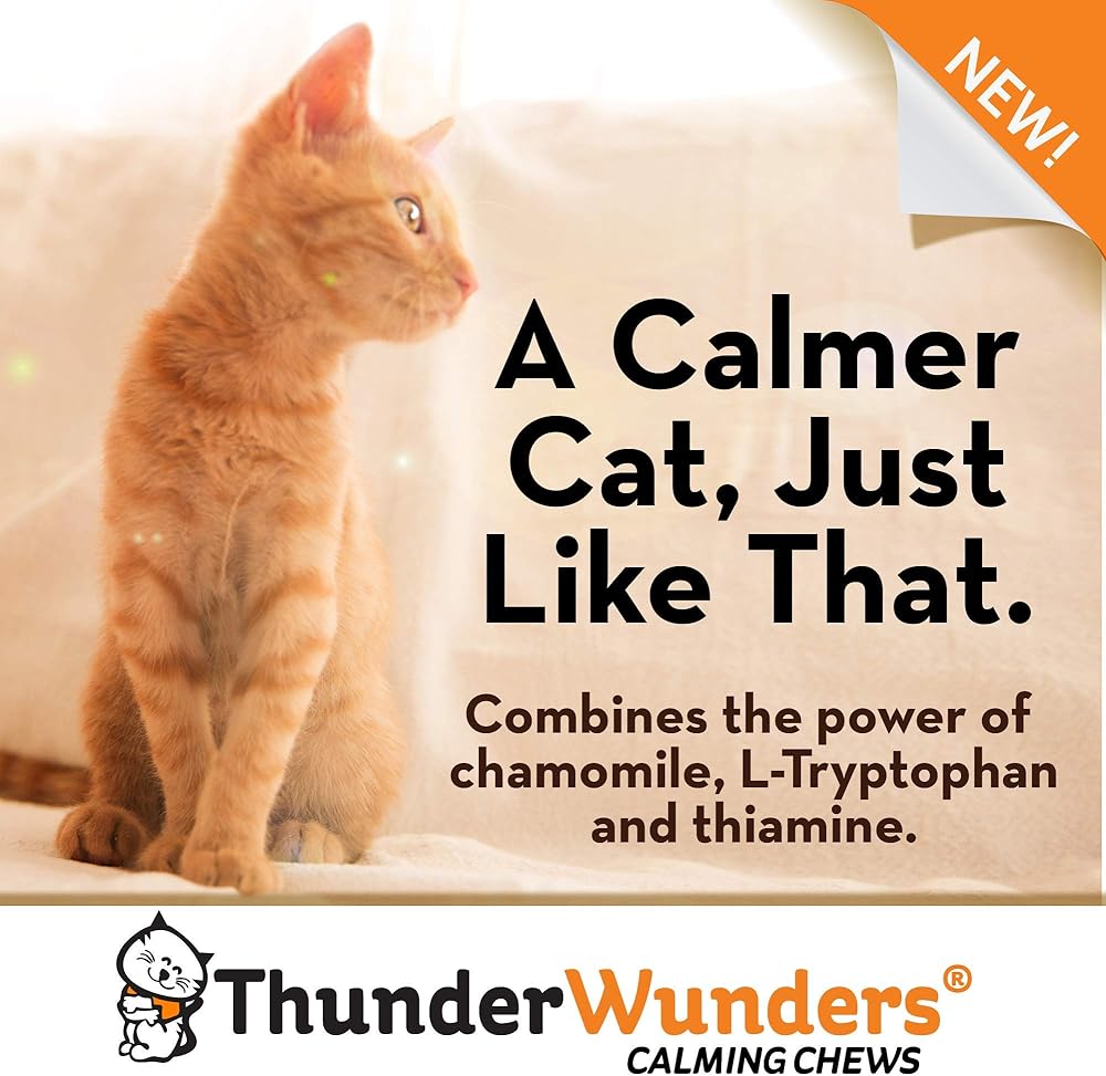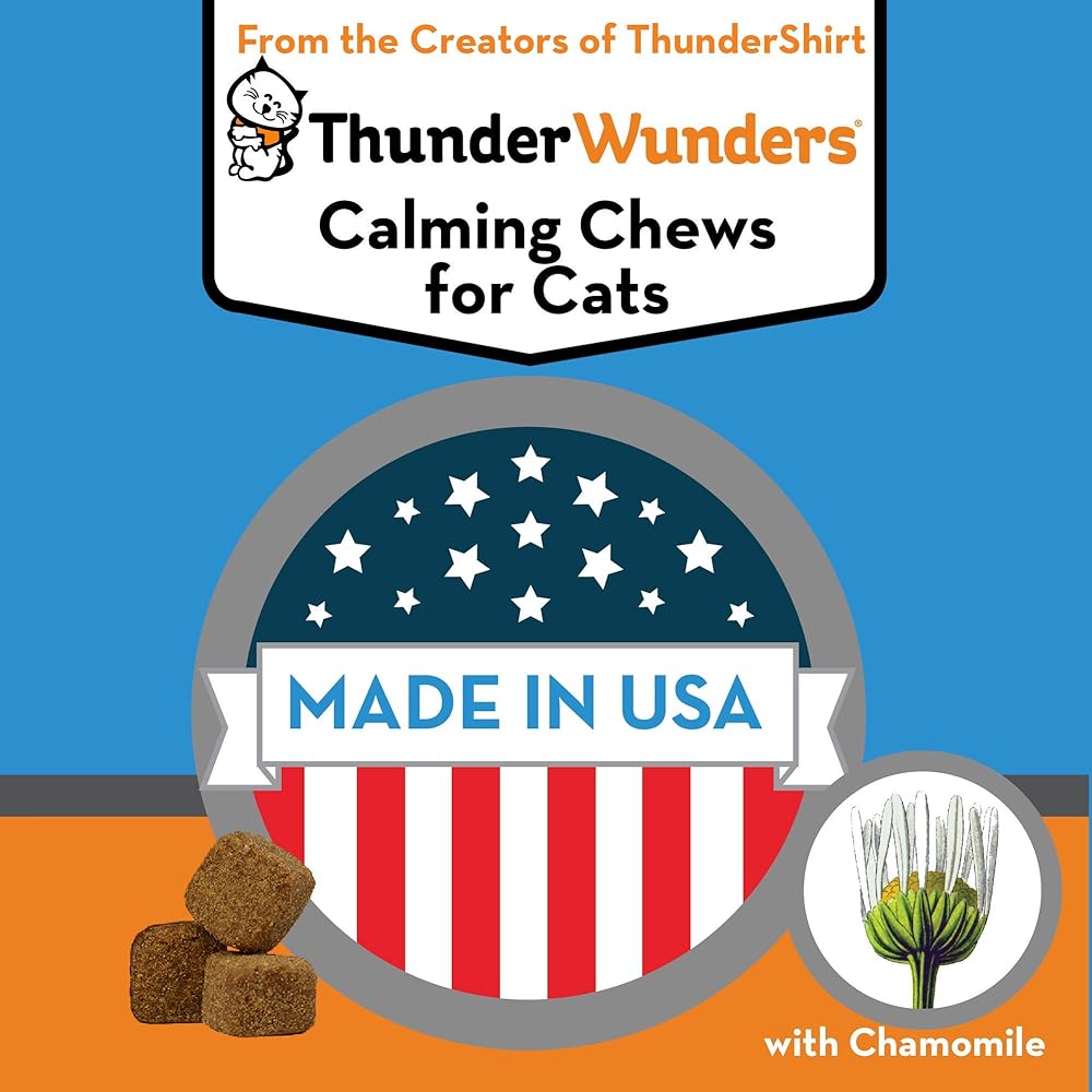 ThunderWunders Cat Calming Chews – Anxiety Supplement with Thiamine, L-Tryptophan, and Chamomile – Relieve Stress from Vet Visits, Separation, Storms, Fireworks & Travel FROM THE CREATORS OF THUNDERSHIRT, the leader in pet calming solutions, Now calm comes in a bite-sized bit for cats in a tasty chicken flavor that even the pickiest of pets will love FINICKY FELINE FLAVOR GUARANTEE: If your cat decides ThunderWunders aren't for them, please return for a refund. We promise our chef won't be offended! STOP CAT ANXIETY AND STRESS caused by traveling, vet visits, thunderstorms, fireworks, or any other stressful event THIAMINE, L-TRYPTOPHAN, AND CHAMOMILE help reduce stress and tension, promoting rest and relaxation VET RECOMMENDED calming chews are safe and effective for cats, plus they're MADE IN THE USA